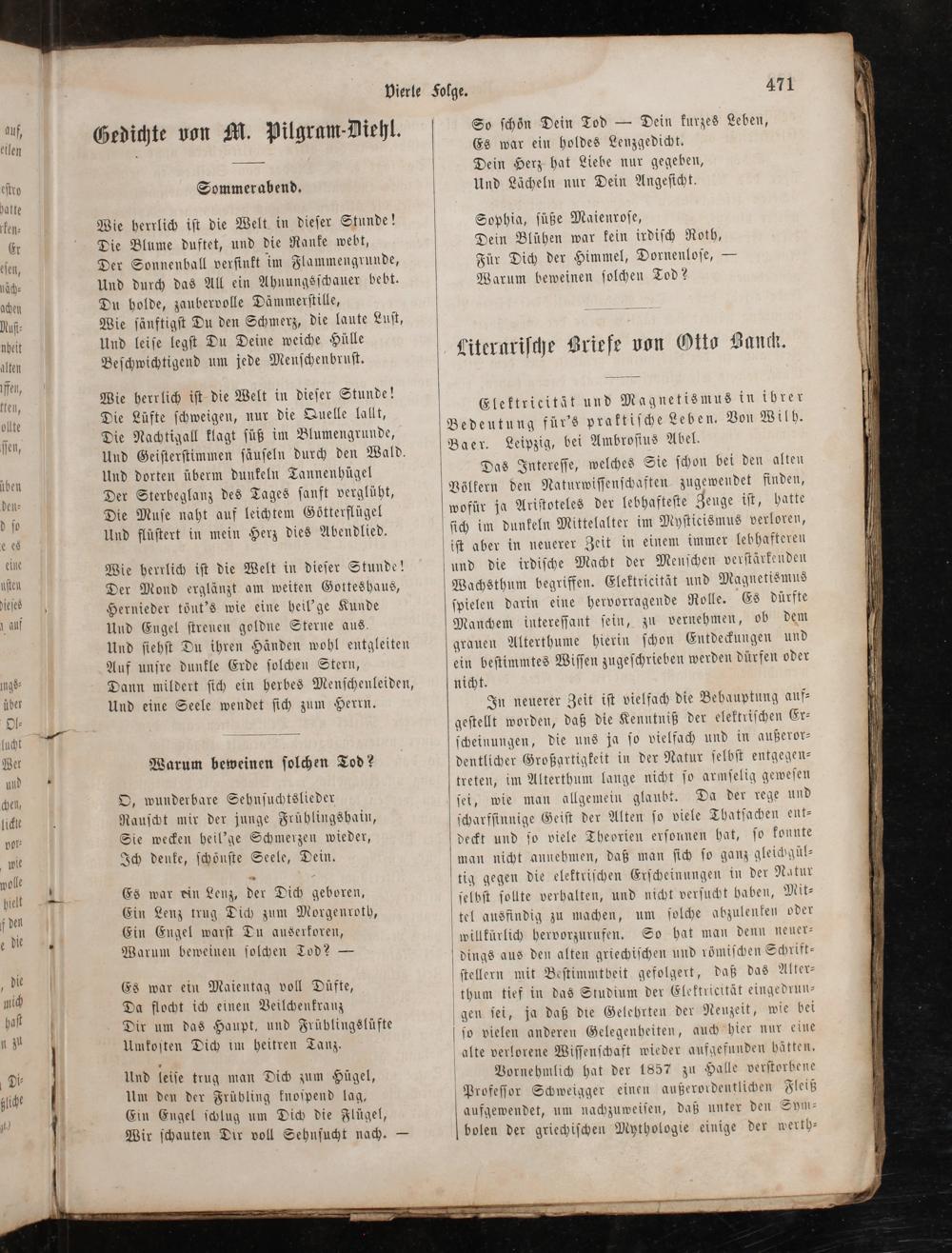 In neuerer Zeit iſt vielfach die Behauptung auf⸗ geſtellt worden, daß die Kenntniß der elektriſchen Er⸗ ſcheinungen, die uns ja ſo vielfach und in außeror⸗ dentlicher Großartigkeit in der Natur ſelbſt entgegen⸗ treten, im Alterthum lange nicht ſo armſelig geweſen ſei, wie man allgemein glaubt. Da der rege und ſcharfſinnige Geiſt der Alten ſo viele Thatſachen ent⸗ deckt und ſo viele Theorien erſonnen hat, ſo konnte man nicht annehmen, daß man ſich ſo ganz gleichgül⸗ tig gegen die elektriſchen Erſcheinungen in der Natur ſelbſt ſollte verhalten, und nicht verſucht haben, Mit⸗ tel ausfindig zu machen, um ſolche abzulenken oder willkürlich hervorzurufen. So hat man denn neuer⸗ V dings aus den alten griechiſchen und römiſchen Schrift⸗ ſtellern mit Beſtimmtbeit gefolgert, daß das Alter⸗ thum tief in das Studium der Elektricität eingedrun⸗ gen ſei, ja daß die Gelehrten der Neuzeit, wie bei [ſo vielen anderen Gelegenheiten, auch hier nur eine alte verlorene Wiſſenſchaft wieder aufgefunden hätten. Vornehmlich hat der 1857 zu Halle verſtorbene Profeſſor Schweigger einen außerordentlichen Fleiß aufgewendet, um nachzuweiſen, daß unter den Sym⸗ bolen der griechiſchen Mythologie einige der werth⸗
