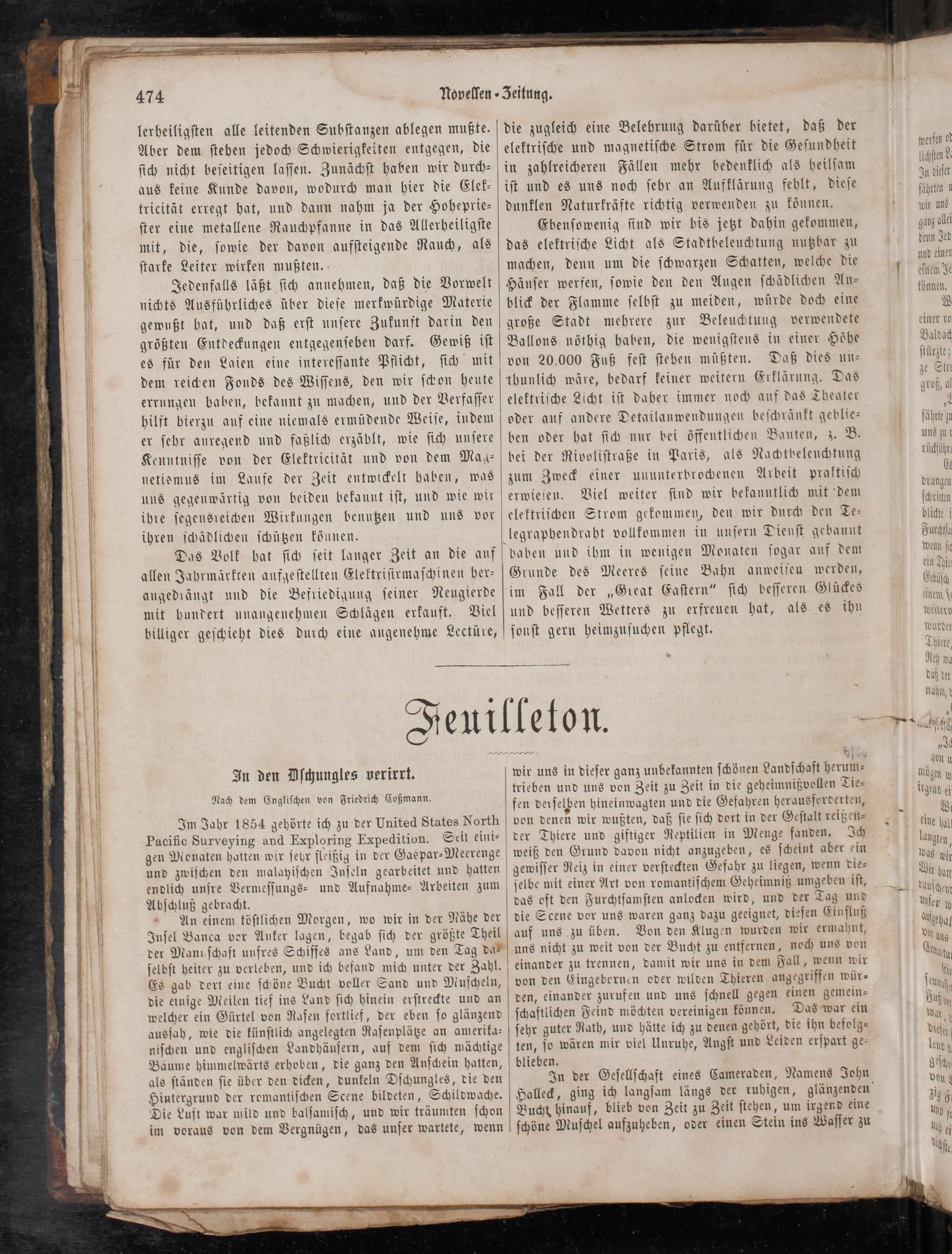 die zugleich eine Belehrung darüber bietet, daß der elektriſche und magnetiſche Strom für die Geſundheit in zahlreicheren Fällen mehr bedenklich als heilſam iſt und es uns noch ſehr an Aufklärung fehlt, dieſe dunklen Naturkräfte richtig verwenden zu können. Ebenſowenig ſind wir bis jetzt dahin gekommen, das elektriſche Licht als Stadtbeleuchtung nutzbar zu machen, denn um die ſchwarzen Schatten, welche die Häuſer werfen, ſowie den den Augen ſchädlichen An⸗ blick der Flamme ſelbſt zu meiden, würde doch eine große Stadt mehrere zur Beleuchtung verwendete Ballons nöthig haben, die wenigſtens in einer Höhe von 20,000 Fuß feſt ſtehen müßten. Daß dies un⸗ thunlich wäre, bedarf keiner weitern Erklärung. Das elektriſche Licht iſt daher immer noch auf das Theater oder auf andere Detailanwendungen beſchränkt geblie⸗ ben oder hat ſich nur bei öffentlichen Bauten, z. B. bei der Rivoliſtraße in Paris, als Nachtbeleuchtung zum Zweck einer ununterbrochenen Arbeit praktiſch erwieſen. Viel weiter ſind wir bekanntlich mit dem elektriſchen Strom gekommen, den wir durch den Te⸗
