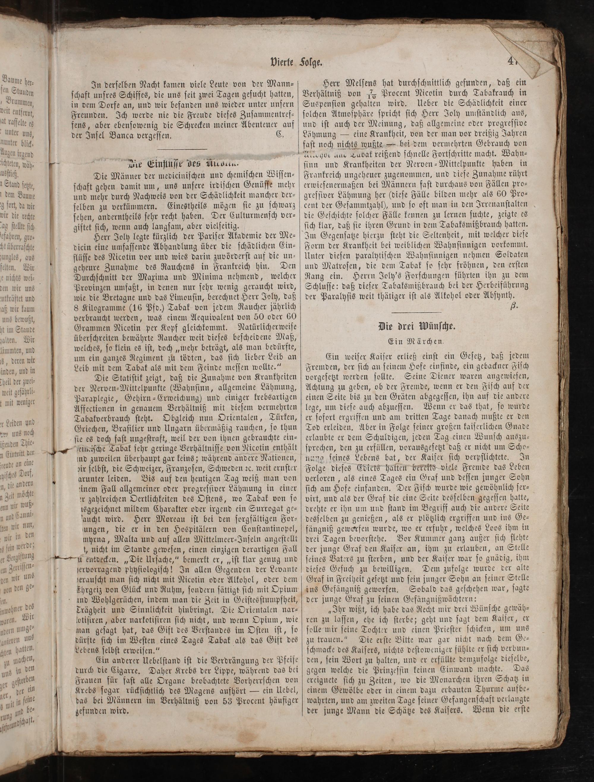 Ein weiſer Kaiſer erließ einſt ein Geſetz, daß jedem Fremden, der ſich an ſeinem Hofe einfinde, ein gebackner Fiſch vorgeſetzt werden ſollte. Seine Diener waren angewieſen, Achtung zu geben, ob der Fremde, wenn er den Fiſch auf der einen Seite bis zu den Gräten abgegeſſen, ihn auf die andere lege, um dieſe auch abzueſſen. Wenn er das that, ſo wurde er ſofort ergriffen und am dritten Tage danach mußte er den Tod erleiden. Aber in Folge ſeiner großen kaiſerlichen Gnade erlaubte er dem Schuldigen, jeden Tag einen Wunſch auszu⸗ ſprechen, den zu erfüllen, vorausgeſetzt daß er nicht um Scho⸗ nang ſeines Lebens bat, der Kaiſer ſich verpflichtete. In Folge dieſes Edicts hatten bereits viele Fremde das Leben verloren, als eines Tages ein Graf und deſſen junger Sohn ſich am Hofe einfanden. Der Fiſch wurde wie gewöhnlich ſer⸗ virt, und als der Graf die eine Seite desſelben gegeſſen hatte, drehte er ihn um und ſtand im Begriff auch die andere Seite desſelben zu genießen, als er plötzlich ergriffen und ins Ge⸗ fängniß geworfen wurde, wo er erfuhr, welches Loos ihm in drei Tagen bevorſtehe. Vor Kummer ganz außer ſich flehte der junge Graf den Kaiſer an, ihm zu erlauben, an Stelle ſeines Vaters zu ſterben, und der Kaiſer war ſo gnädig, ihm dieſes Geſuch zu bewilligen. Dem zufolge wurde der alte Graf in Freiheit geſetzt und ſein junger Sohn an ſeiner Stelle ins Gefängniß geworfen. Sobald das geſchehen war, ſagte der junge Graf zu ſeinen Gefängnißwächtern: