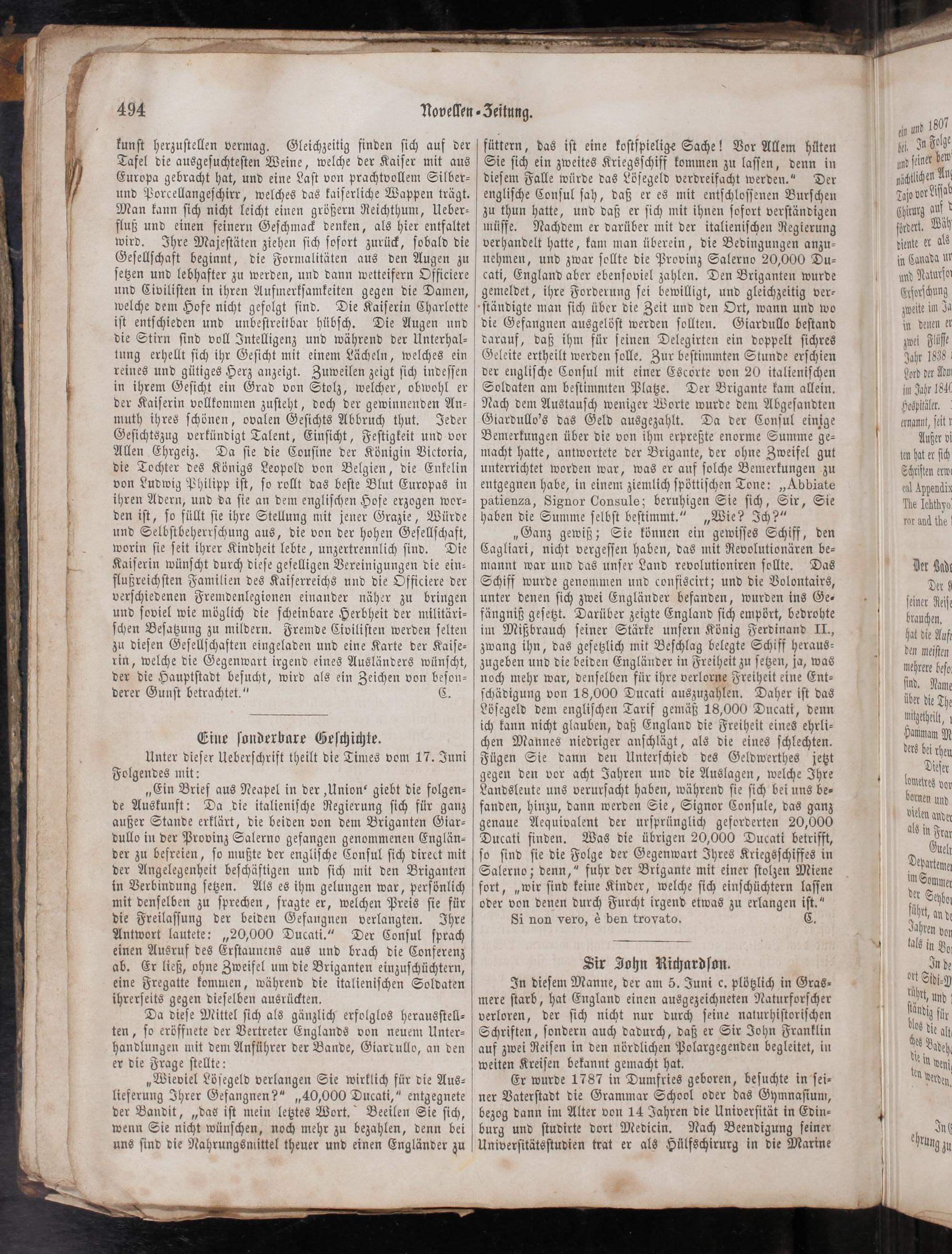 0 außer Stande erklärt, die beiden von dem Briganten Giar⸗ genaue Aequivalent der urſprünglich geforderten 20,000 unde dullo in der Provinz Salerno gefangen genommenen Englän⸗ Ducati finden. Was die übrigen 20,000 Ducgati betrifft, U der zu befreien, ſo mußte der engliſche Conſul ſich direct mit ſo ſind ſie die Folge der Gegenwart Ihres Kriegsſchiffes in Deon der Angelegenheit beſchäftigen und ſich mit den Briganten Salerno; denn,“ fuhr der Brigante mit einer ſtolzen Miene Pn nan in Verbindung ſetzen. Als es ihm gelungen war, perſönlich fort,„wir ſind keine Kinder, welche ſich einſchüchtern laſſen 3 Lund 3 mit denſelben zu ſprechen, fragte er, welchen Preis ſie für oder von denen durch Furcht irgend etwas zu erlangen iſt.“ fähr ehbo die Freilaſſung der beiden Gefangnen verlangten. Ihre Si non vero, è ben trovato. C. dhr an de Antwort lautete:„20,000 Ducati.“ Der Conſul ſprach 4— ad 4 von einen Ausruf des Erſtaunens aus und brach die Conferenz 4. in Bo ab. Er ließ, ohne Zweifel um die Briganten einzuſchüchtern, Sir John Richardſon. d In de eine Fregatte kommen, während die italieniſchen Soldaten In dieſem Manne, der am 5. Juni c. plötzlich in Gras⸗ Sddi⸗U ihrerſeits gegen dieſelben ausrückten. mere ſtarb, hat England einen ausgezeichneten Naturforſcher 1 5 und Da dieſe Mittel ſich als gänzlich erfolglos herausſtell⸗ verloren, der ſich nicht nur durch ſeine naturhiſtoriſchen dundh für 1 ten, ſo eröffnete der Vertreter Englands von neuem Unter⸗ Schriften, ſondern auch dadurch, daß er Sir John Franklin 43 die alt handlungen mit dem Anführer der Bande, Giardullo, an den auf zwei Reiſen in den nördlichen Polargegenden begleitet, in ds ndeh er die Frage ſtellte: weiten Kreiſen bekannt gemacht hat. n in wenie „Wieviel Löſegeld verlangen Sie wirklich für die Aus⸗ Er wurde 1787 in Dunfries geboren, beſuchte in ſei⸗ V ſen werden lieferung Ihrer Gefangnen?“„40,000 Ducati,“ entgegnete ner Vaterſtadt die Grammar School oder das Gymnaſium, der Bandit,„das iſt mein letztes Wort. Beeilen Sie ſich, bezog dann im Alter von 14 Jahren die Univerſität in Edin⸗„. wenn Sie nicht wünſchen, noch mehr zu bezahlen, denn bei burg und ſtudirte dort Medicin. Nach Beendigung ſeiner en uns ſind die Nahrungsmittel theuer und einen Engländer zu Univerſitätsſtudien trat er als Hülfschirurg in die Marine rung zu 8 4 4 „