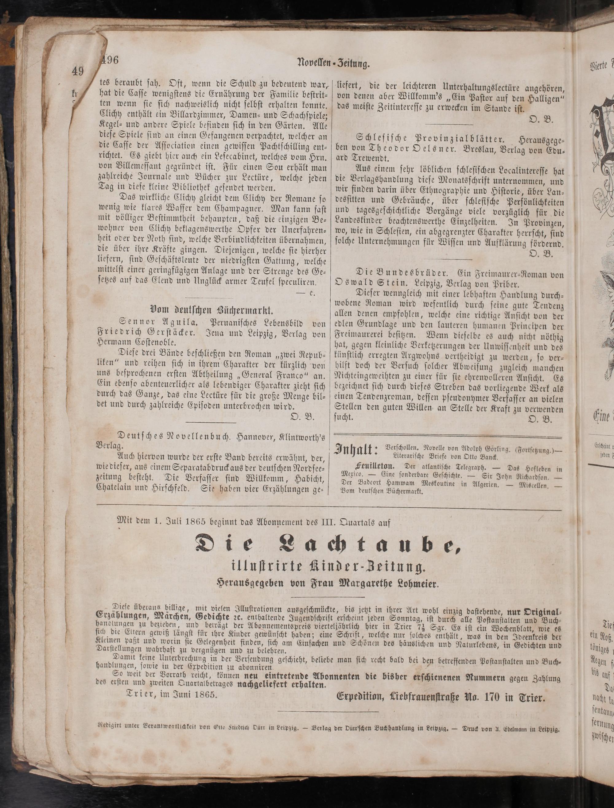 Erzählungen, Märchen, Gedichte ꝛc. enthaltende Jugendſchrift erſcheint jeden Sonntag, iſt durch alle Poſtanſtalten und Buch⸗ handlungen zu beziehen, und beträgt der Abonnementspreis vierteljährlich hier in Trier 7 ½ Sgr. Es iſt ein Wochenblatt, wie es