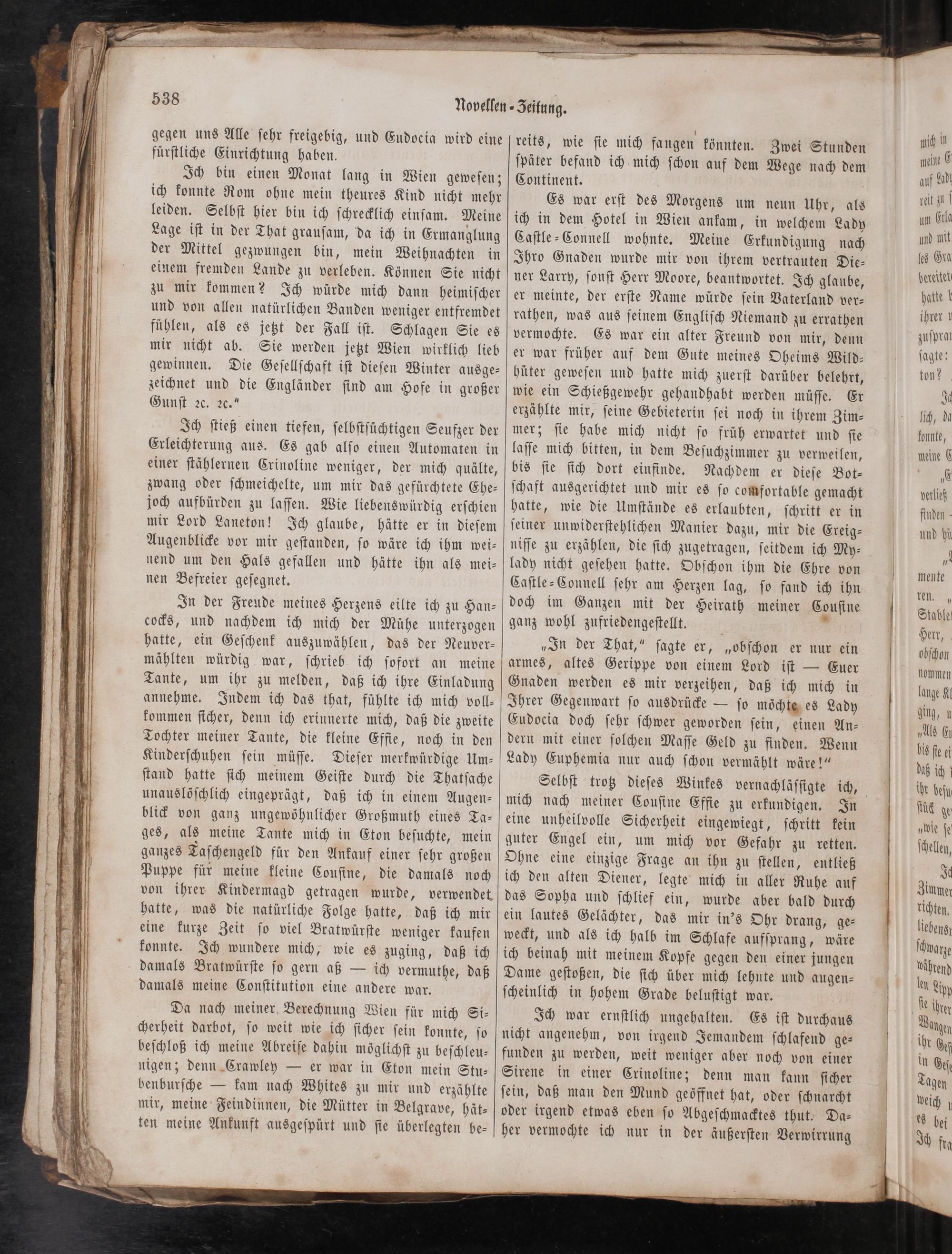 Es war erſt des Morgens um neun Uhr, als ich in dem Hotel in Wien ankam, in welchem Lady Caſtle⸗Connell wohnte. Meine Erkundigung nach Ihro Gnaden wurde mir von ihrem vertrauten Die⸗ ner Larry, ſonſt Herr Moore, beantwortet. Ich glaube, er meinte, der erſte Name würde ſein Vaterland ver⸗ rathen, was aus ſeinem Engliſch Niemand zu errathen vermochte. Es war ein alter Freund von mir, denn er war früher auf dem Gute meines Oheims Wild⸗ hüter geweſen und hatte mich zuerſt darüber belehrt, wie ein Schießgewehr gehandhabt werden müſſe. Er erzählte mir, ſeine Gebieterin ſei noch in ihrem Zim⸗ mer; ſie habe mich nicht ſo früh erwartet und ſie laſſe mich bitten, in dem Beſuchzimmer zu verweilen, bis ſie ſich dort einfinde. Nachdem er dieſe Bot⸗ ſchaft ausgerichtet und mir es ſo comfortable gemacht hatte, wie die Umſtände es erlaubten, ſchritt er in ſeiner unwiderſtehlichen Manier dazu, mir die Ereig⸗ niſſe zu erzählen, die ſich zugetragen, ſeitdem ich My⸗ lady nicht geſehen hatte. Obſchon ihm die Ehre von Caſtle⸗Connell ſehr am Herzen lag, ſo fand ich ihn doch im Ganzen mit der Heirath meiner Couſine
