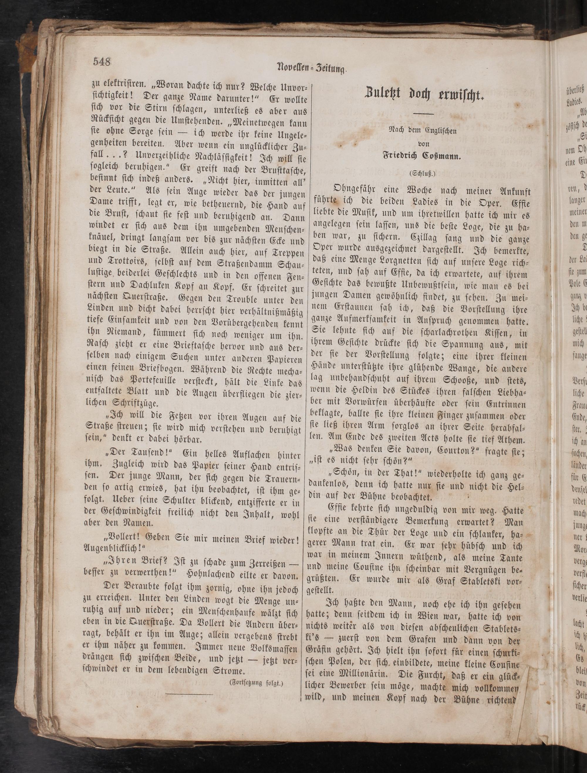 Effie kehrte ſich ungeduldig von mir weg. Hatte ſie eine verſtändigere Bemerkung erwartet? Man klopfte an die Thür der Loge und ein ſchlanker, ha⸗ gerer Mann trat ein. Er war ſehr hübſch und ich war in meinem Innern wüthend, als meine Tante und meine Couſine ihn ſcheinbar mit Vergnügen be⸗ grüßten. Er wurde mir als Graf Stabletski vor⸗ geſtellt.—