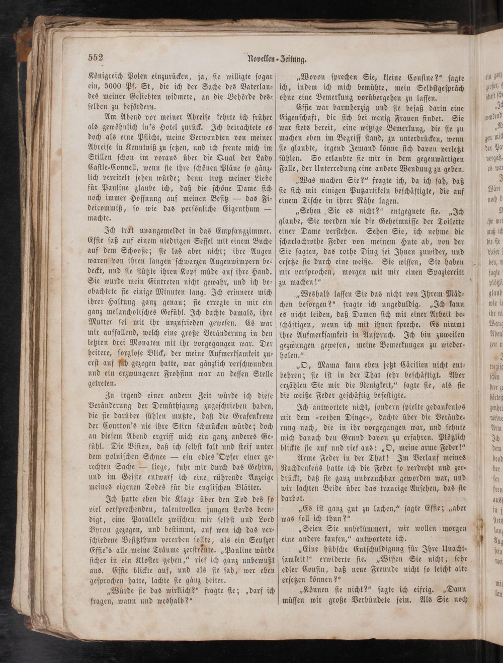 Zu irgend einer andern Zeit würde ich dieſe Veränderung der Demüthigung zugeſchrieben haben, die ſie darüber fühlen mußte, daß die Grafenkrone der Courton's nie ihre Stirn ſchmücken würde; doch an dieſem Abend ergriff mich ein ganz anderes Ge⸗ fühl. Die Viſion, daß ich ſelbſt kalt und ſteif unter dem polniſchen Schnee— ein edles Opfer einer ge⸗ rechten Sache— liege, fuhr mir durch das Gehirn, und im Geiſte entwarf ich eine rührende Anzeige meines eigenen Todes für die engliſchen Blätter.