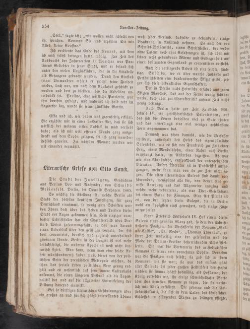So wichtig die Stellung iſt, welche Berlin als Stadt der höchſten deutſchen Intelligenz für ganz Deutſchland einnimmt, ſo wenig gute Schriften wer⸗ den Ihnen doch über das Leben und Treiben dieſer Stadt vor Augen gekommen ſein. Kein einziger nam⸗ hafter Schriftſteller hat ein Charakterbild über Ber⸗ lin's Weſen zuſammengefaßt, ſo daß man daraus einen Ueberblick über den geiſtigen Gehalt, der ſich dort concentrirt, deutlich und zugleich unterhaltend gewinnen könnte. Berlin in der Vorzeit iſt viel mehr berückſichtigt, die moderne Epoche iſt noch nicht lite⸗ rariſch fixirt. Man kann, wenn man eine ſolche Ar⸗ beit wünſchenswerth finden muß, direct von der poli⸗ tiſchen Seite der preußiſchen Metropole abſehen, da ſchon das ſociale Leben politiſchen Nerv genug ent⸗ hält und es weſentlich auf jene innere Culturbaſis ankommt, die einen längeren Beſtand als die Tages⸗ politik hat und auf die allgemeine Entwickelung der Bildung dauernd einwirkt.
