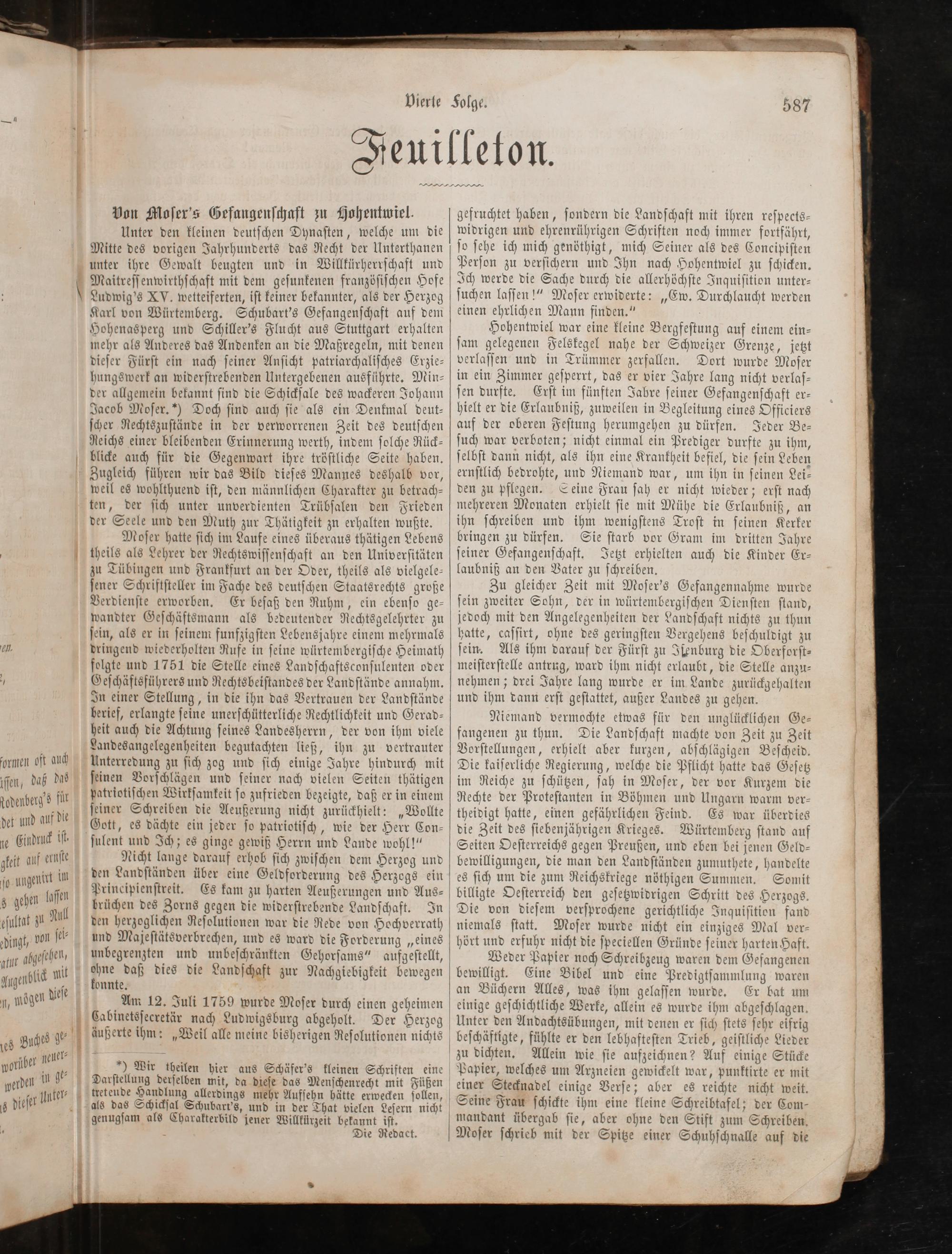 Hohentwiel war eine kleine Bergfeſtung auf einem ein— ſam gelegenen Felskegel nahe der Schweizer Grenze, jetzt verlaſſen und in Trümmer zerfallen. Dort wurde Moſer in ein Zimmer geſperrt, das er vier Jahre lang nicht verlaſ⸗ ſen durfte. Erſt im fünften Jabre ſeiner Gefangenſchaft er— hielt er die Erlaubniß, zuweilen in Begleitung eines Officiers auf der oberen Feſtung herumgehen zu dürfen. Jeder Be⸗ ſuch war verboten; nicht einmal ein Prediger durfte zu ihm, ſelbſt dann nicht, als ihn eine Krankheit befiel, die ſein Leben ernſtlich bedrohte, und Niemand war, um ihn in ſeinen Lei— den zu pflegen. Seine Frau ſah er nicht wieder; erſt nach mehreren Monaten erhielt ſie mit Mühe die Erlaubniß, an ihn ſchreiben und ihm wenigſtens Troſt in ſeinen Kerker bringen zu dürfen. Sie ſtarb vor Gram im dritten Jahre ſeiner Gefangenſchaft. Jetzt erhielten auch die Kinder Er⸗ laubniß an den Vater zu ſchreiben.