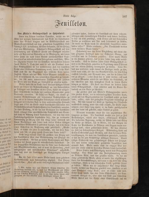 Ludwig's XV. wetteiferten, iſt keiner bekannter, als der Herzog Karl von Würtemberg. Schubart's Gefangenſchaft auf dem Hohenasperg und Schiller's Flucht aus Stuttgart erhalten mehr als Anderes das Andenken an die Maßregeln, mit denen dieſer Fürſt ein nach ſeiner Anſicht patriarchaliſches Erzie⸗ hungswerk an widerſtrebenden Untergebenen ausführte. Min⸗ der allgemein bekannt ſind die Schickſale des wackeren Johann Jacob Moſer.*) Doch ſind auch ſie als ein Denkmal deut⸗ ſcher Rechtszuſtände in der verworrenen Zeit des deutſchen Reichs einer bleibenden Erinnerung werth, indem ſolche Rück⸗ blicke auch für die Gegenwart ihre tröſtliche Seite haben. Zugleich führen wir das Bild dieſes Mannes deshalb vor, weil es wohlthuend iſt, den männlichen Charakter zu betrach⸗ ten, der ſich unter unverdienten Trübſalen den Frieden der Seele und den Muth zur Thätigkeit zu erhalten wußte. Moſer hatte ſich im Laufe eines überaus thätigen Lebens theils als Lehrer der Rechtswiſſenſchaft an den Univerſitäten zu Tübingen und Frankfurt an der Oder, theils als vielgele— ſener Schriftſteller im Fache des deutſchen Staatsrechts große Verdienſte erworben. Er beſaß den Ruhm, ein ebenſo ge⸗ wandter Geſchäftsmann als bedeutender Rechtsgelehrter zu