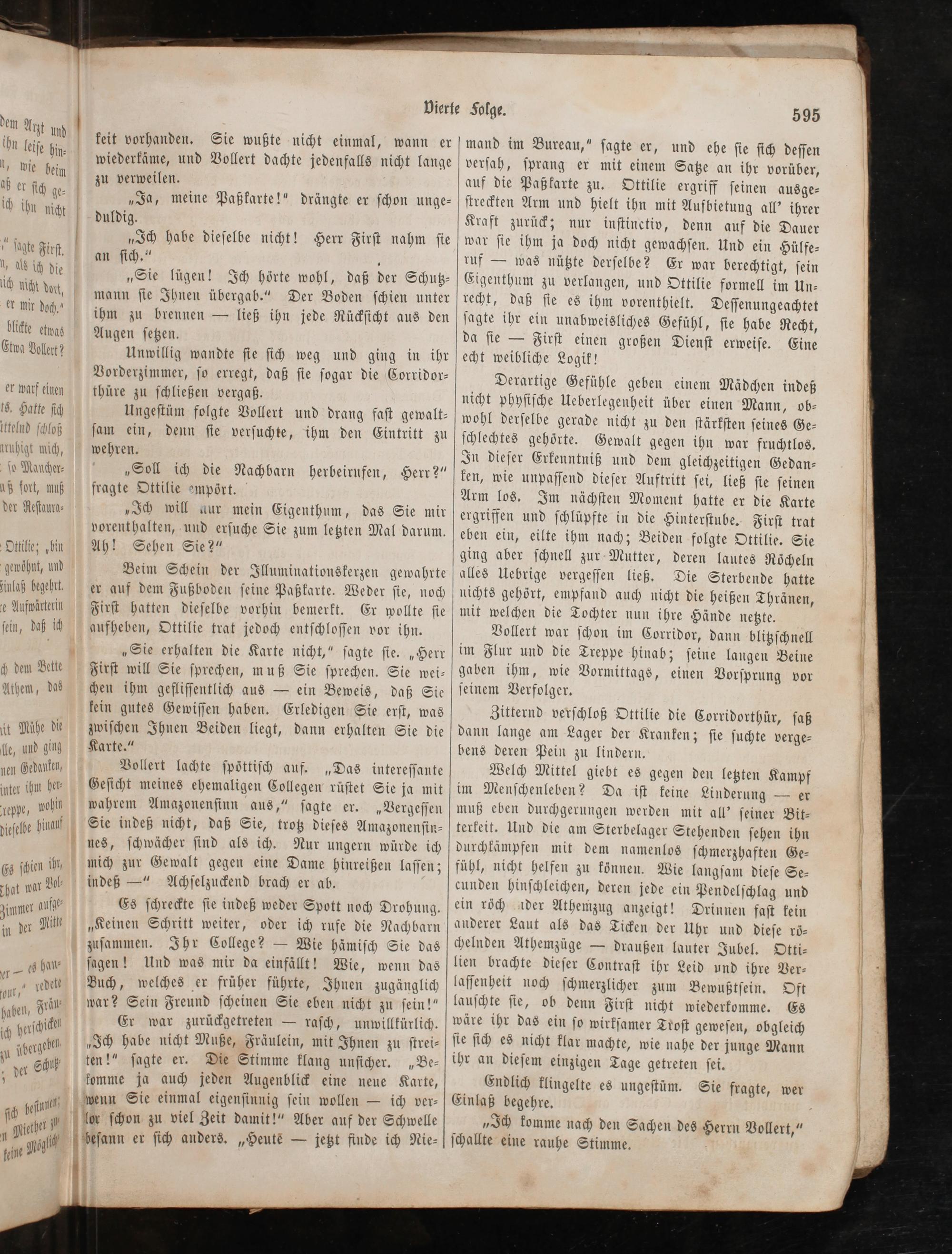 mand im Bureau,“ ſagte er, und ehe ſie ſich deſſen verſah, ſprang er mit einem Satze an ihr vorüber, auf die Paßkarte zu. Ottilie ergriff ſeinen ausge⸗ ſtreckten Arm und hielt ihn mit Aufbietung all' ihrer Kraft zurück; nur inſtinctiv, denn auf die Dauer war ſie ihm ja doch nicht gewachſen. Und ein Hülfe⸗ ruf— was nützte derſelbe? Er war berechtigt, ſein Eigenthum zu verlangen, und Ottilie formell im Un⸗ recht, daß ſie es ihm vorenthielt. Deſſenungeachtet ſagte ihr ein unabweisliches Gefühl, ſie habe Recht, da ſie— Firſt einen großen Dienſt erweiſe. Eine echt weibliche Logik!