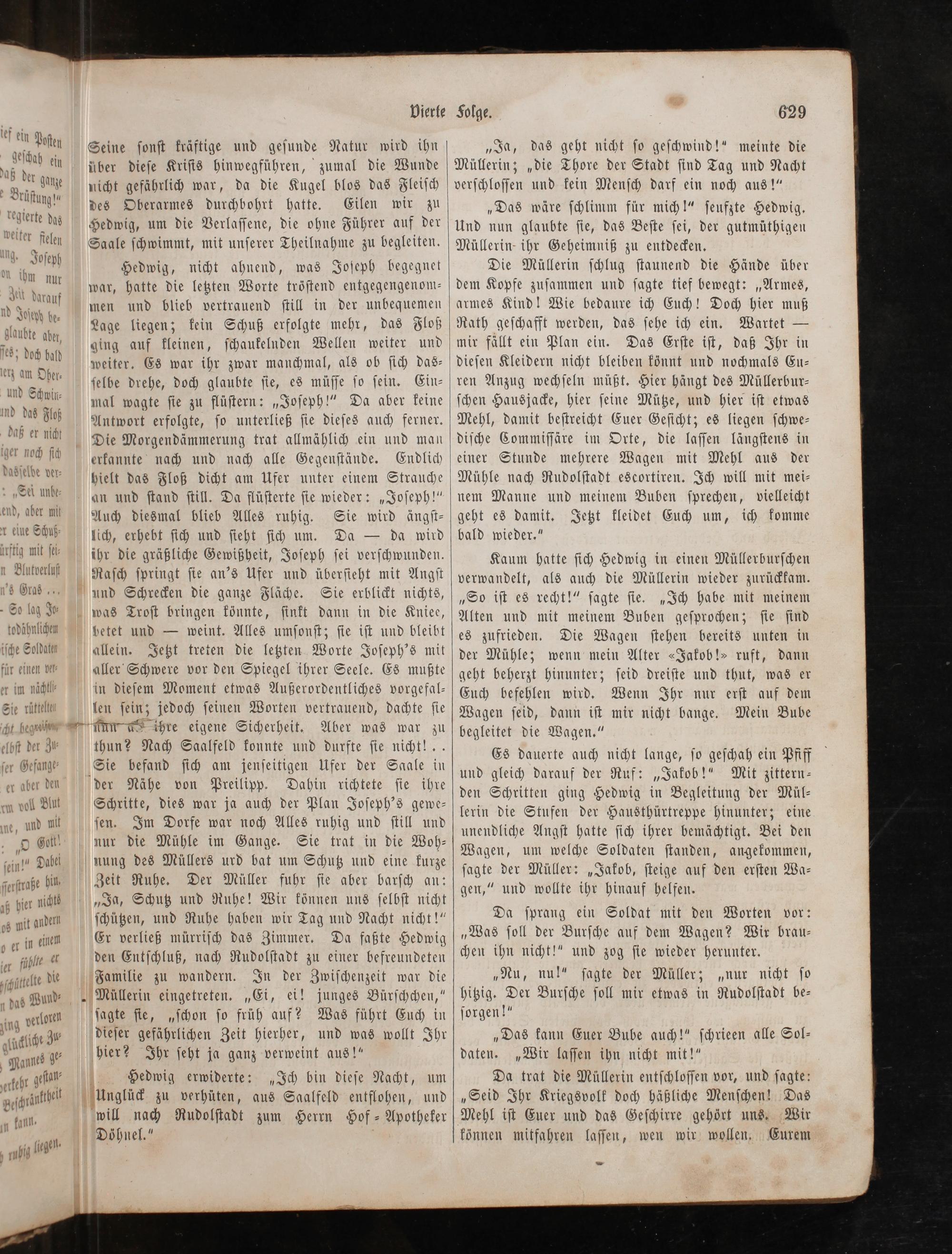 Hedwig, nicht ahnend, was Joſeph begegnet Die Müllerin ſchlug ſtaunend die Hände über war, hatte die letzten Worte tröſtend entgegengenom⸗ dem Kopfe zuſammen und ſagte tief bewegt:„Armes, men und blieb vertrauend ſtill in der unbequemen armes Kind! Wie bedaure ich Euch! Doch hier muß Lage liegen; kein Schuß erfolgte mehr, das Floß Rath geſchafft werden, das ſehe ich ein. Wartet— ging auf kleinen, ſchaukelnden Wellen weiter und mir fällt ein Plan ein. Das Erſte iſt, daß Ihr in weiter. Es war ihr zwar manchmal, als ob ſich das⸗ dieſen Kleidern nicht bleiben könnt und nochmals Eu⸗ ſelbe drehe, doch glaubte ſie, es müſſe ſo ſein. Ein⸗ ren Anzug wechſeln müßt. Hier hängt des Müllerbur⸗ mal wagte ſie zu flüſtern:„Joſeph!“ Da aber keine ſchen Hausjacke, hier ſeine Mütze, und hier iſt etwas Antwort erfolgte, ſo unterließ ſie dieſes auch ferner. Mehl, damit beſtreicht Euer Geſicht; es liegen ſchwe⸗ Die Morgendämmerung trat allmählich ein und man diſche Commiſſäre im Orte, die laſſen längſtens in erkannte nach und nach alle Gegenſtände. Endlich einer Stunde mehrere Wagen mit Mehl aus der hielt das Floß dicht am Ufer unter einem Strauche Mühle nach Rudolſtadt escortiren. Ich will mit mei⸗ an und ſtand ſtill. Da flüſterte ſie wieder:„Joſeph!“ nem Manne und meinem Buben ſprechen, vielleicht Auch diesmal blieb Alles ruhig. Sie wird ängſt⸗ geht es damit. Jetzt kleidet Euch um, ich komme lich, erhebt ſich und ſieht ſich um. Da— da wird bald wieder.“ ihr die gräßliche Gewißheit, Joſeph ſei verſchwunden. Kaum hatte ſich Hedwig in einen Müllerburſchen Raſch ſpringt ſie an's Ufer und überſieht mit Angſt verwandelt, als auch die Müllerin wieder zurückkam. und Schrecken die ganze Fläche. Sie erblickt nichts,„So iſt es recht!“ ſagte ſie.„Ich habe mit meinem Alten und mit meinem Buben geſprochen; ſie ſind betet und— weint. Alles umſonſt; ſie iſt und bleibt es zufrieden. Die Wagen ſtehen bereits unten in allein. Jetzt treten die letzten Worte Joſeph's mit der Mühle; wenn mein Alter ⸗Jakob!» ruft, dann aller Schwere vor den Spiegel ihrer Seele. Es mußte geht beherzt hinunter; ſeid dreiſte und thut, was er in dieſem Moment etwas Außerordentliches vorgefal⸗ Euch befehlen wird. Wenn Ihr nur erſt auf dem len ſein; jedoch ſeinen Worten vertrauend, dachte ſie Wagen ſeid, dann iſt mir nicht bange. Mein Bube