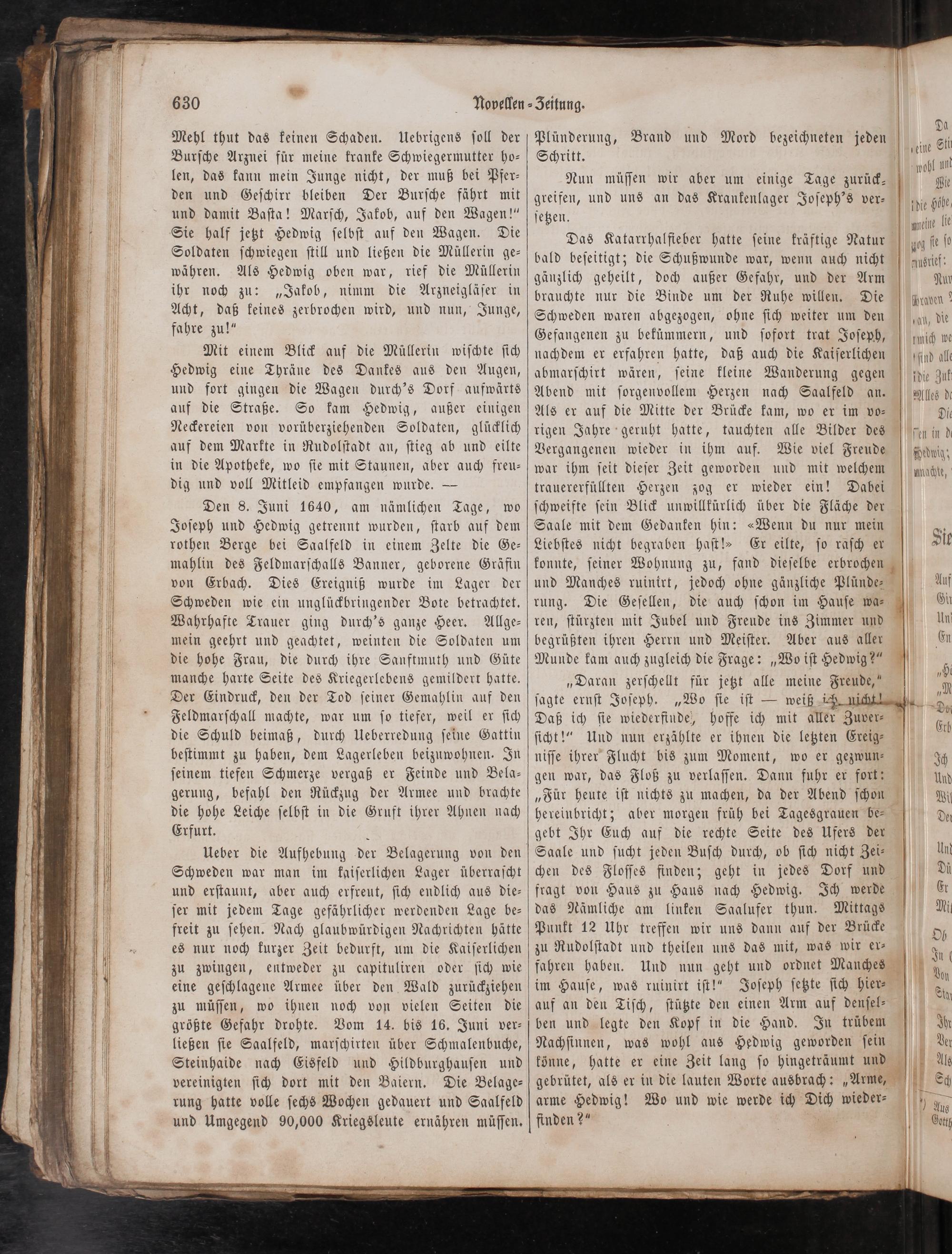 Den 8. Juni 1640, am nämlichen Tage, wo Joſeph und Hedwig getrennt wurden, ſtarb auf dem rothen Berge bei Saalfeld in einem Zelte die Ge⸗ mahlin des Feldmarſchalls Banner, geborene Gräfin von Erbach. Dies Ereigniß wurde im Lager der Schweden wie ein unglückbringender Bote betrachtet. Wahrhafte Trauer ging durch's ganze Heer. Allge⸗ mein geehrt und geachtet, weinten die Soldaten um die hohe Frau, die durch ihre Sanftmuth und Güte manche harte Seite des Kriegerlebens gemildert hatte. Der Eindruck, den der Tod ſeiner Gemahlin auf den Feldmarſchall machte, war um ſo tiefer, weil er ſich die Schuld beimaß, durch Ueberredung ſeine Gattin beſtimmt zu haben, dem Lagerleben beizuwohnen. In ſeinem tiefen Schmerze vergaß er Feinde und Bela⸗ gerung, befahl den Rückzug der Armee und brachte die hohe Leiche ſelbſt in die Gruft ihrer Ahnen nach Erfurt.