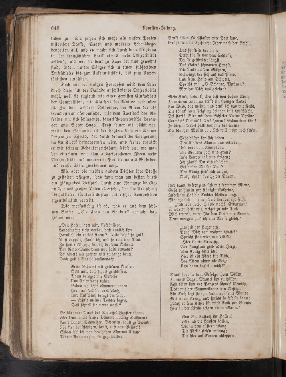 Doch nur bei einigen Franzoſen wird dem Leſer durch dieſe ſich der Ballade anſchließende Objectivität wohl, weil ſie zugleich mit einer gewiſſen Einfachheit der Compoſition, mit Klarheit der Motive verbunden iſt. Zu ihnen gehören Delavigne, vor Allem der als Compoſiteur ökonomiſche, mit dem Tactſtock des Re⸗ frains um ſich ſchlagende, fanatiſch⸗patriotiſche Beran⸗ ger und Victor Hugo. Trotz ſeiner oft höchſt vor⸗ waltenden Romantik iſt der Letztere doch ein Kenner desjenigen Effects, der durch dramatiſche Steigerung im Kunſtwerk hervorgerufen wird, und ferner erquickt er mit ſeinem Gedankenreichthum ſelbſt da, wo man den einzelnen von ihm ausgeſprochenen Ideen mehr Originalität und manierirte Pointirung als Wahrheit und ernſte Tiefe zuerkennen muß.