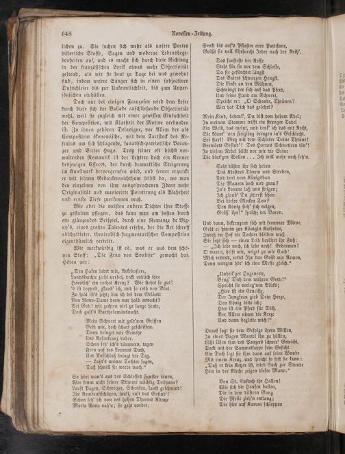 Wie aber die meiſten andern Dichter ihre Stoffe zu geſtalten pflegen, das kann man am beſten durch ein glänzendes Beiſpiel, durch eine Romanze de Vig⸗ ny's, eines großen Talentes erſehn, der die Art ſchroff abſchattirter, theatraliſch⸗fragmentariſcher Compoſition eigenthümlich vertritt.