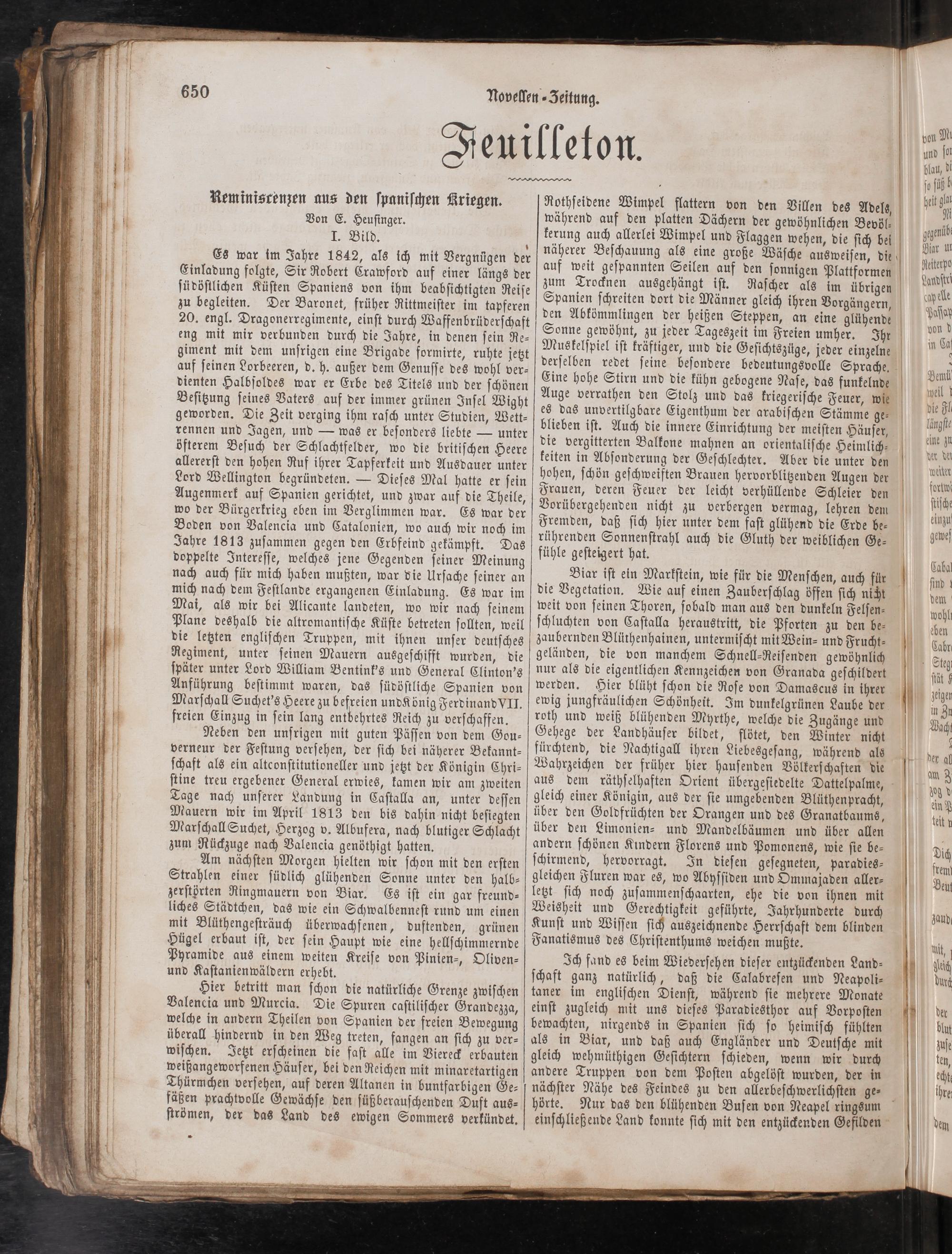 1 Es war im Jahre 1842, als ich mit Vergnügen der Einladung folgte, Sir Robert Crawford auf einer längs der ſüdöſtlichen Küſten Spaniens von ihm beabſichtigten Reiſe zu begleiten. Der Baronet, früher Rittmeiſter im tapferen 20. engl. Dragonerregimente, einſt durch Waffenbrüderſchaft eng mit mir verbunden durch die Jahre, in denen ſein Re⸗ giment mit dem unſrigen eine Brigade formirte, ruhte jetzt auf ſeinen Lorbeeren, d. h. außer dem Genuſſe des wohl ver⸗ dienten Halbſoldes war er Erbe des Titels und der ſchönen Beſitzung ſeines Vaters auf der immer grünen Inſel Wight geworden. Die Zeit verging ihm raſch unter Studien, Wett⸗ rennen und Jagen, und— was er beſonders liebte— unter öfterem Beſuch der Schlachtfelder, wo die britiſchen Heere allererſt den hohen Ruf ihrer Tapferkeit und Ausdauer unter Lord Wellington begründeten.— Dieſes Mal hatte er ſein Augenmerk auf Spanien gerichtet, und zwar auf die Theile, wo der Bürgerkrieg eben im Verglimmen war. Es war der Boden von Valencia und Catalonien, wo auch wir noch im Jahre 1813 zuſammen gegen den Erbfeind gekämpft. Das doppelte Intereſſe, welches jene Gegenden ſeiner Meinung nach auch für mich haben mußten, war die Urſache ſeiner an mich nach dem Feſtlande ergangenen Einladung. Es war im Mai, als wir bei Alicante landeten, wo wir nach ſeinem Plane deshalb die altromantiſche Küſte betreten ſollten, weil die letzten engliſchen Truppen, mit ihnen unſer deutſches Regiment, unter ſeinen Mauern ausgeſchifft wurden, die ſpäter unter Lord William Bentink's und General Clinton's Anführung beſtimmt waren, das ſüdöſtliche Spanien von Marſchall Suchet's Heere zu befreien undK önig Ferdinand VII. freien Einzug in ſein lang entbehrtes Reich zu verſchaffen.