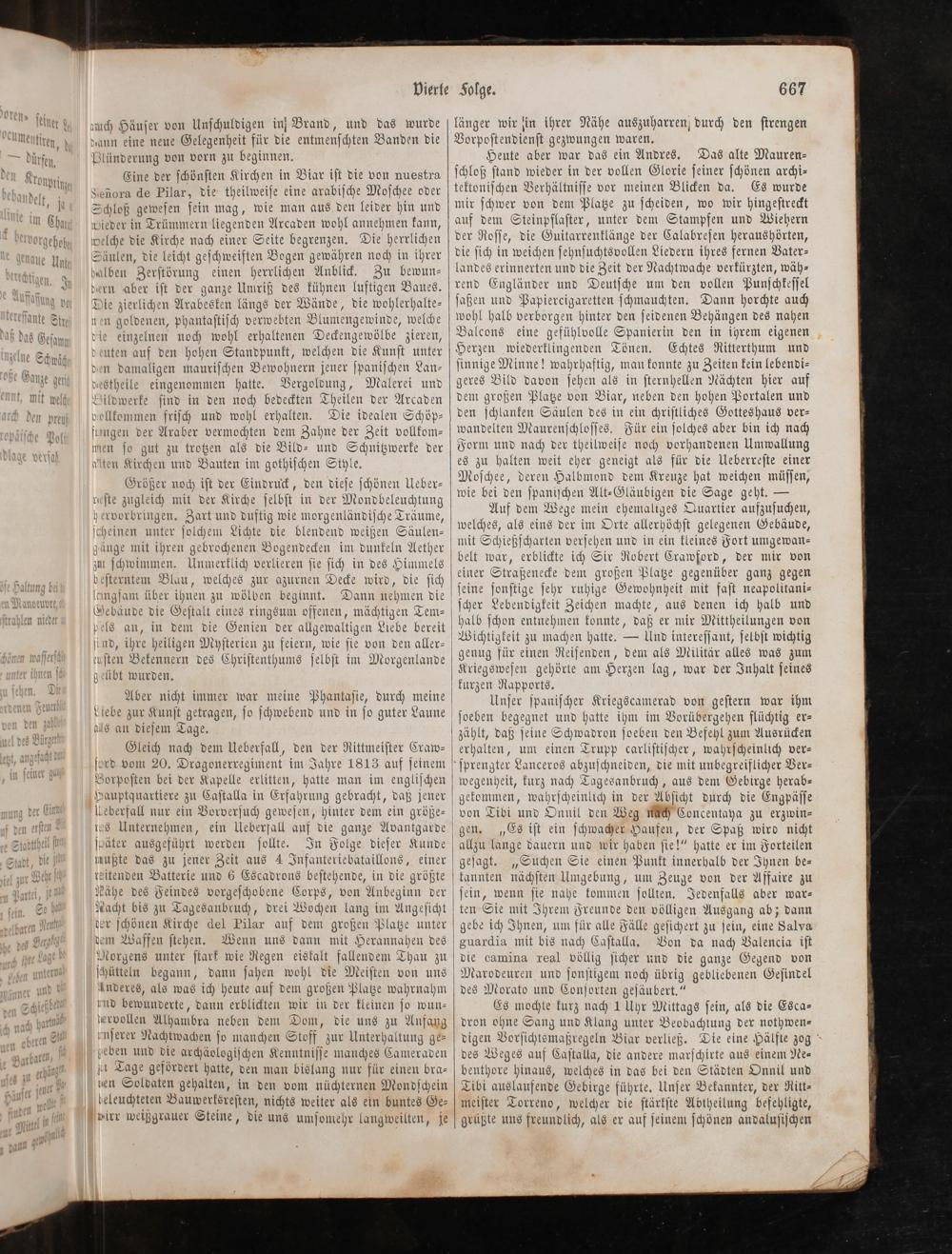 ſpäter ausgeführt werden ſollte. In Folge dieſer Kunde mußte das zu jener Zeit aus 4 JInfanteriebataillons, einer reitenden Batterie und 6 Escadrons beſtehende, in die größte Kähe des Feindes vorgeſchobene Corps, von Anbeginn der Nacht bis zu Tagesanbruch, drei Wochen lang im Angeſicht der ſchönen Kirche del Pilar auf dem großen Platze unter dem Waffen ſtehen. Wenn uns dann mit Herannahen des Morgens unter ſtark wie Regen eiskalt fallendem Thau zu ſchütteln begann, dann ſahen wohl die Meiſten von uns Anderes, als was ich heute auf dem großen Platze wahrnahm und bewunderte, dann erblickten wir in der kleinen ſo wun⸗ dervollen Alhambra neben dem Dom, die uns zu Anfang enſerer Nachtwachen ſo manchen Stoff zur Unterhaltung ge⸗ b peben und die archäologiſchen Kenntniſſe manches Cameraden zu Tage gefördert hatte, den man bislang nur für einen bra⸗ ven Soldaten gehalten, in den vom nüchternen Mondſchein deleuchteten Bauwerksreſten, nichts weiter als ein buntes Ge⸗ virr weißgrauer Steine, die uns umſomehr langweilten, je