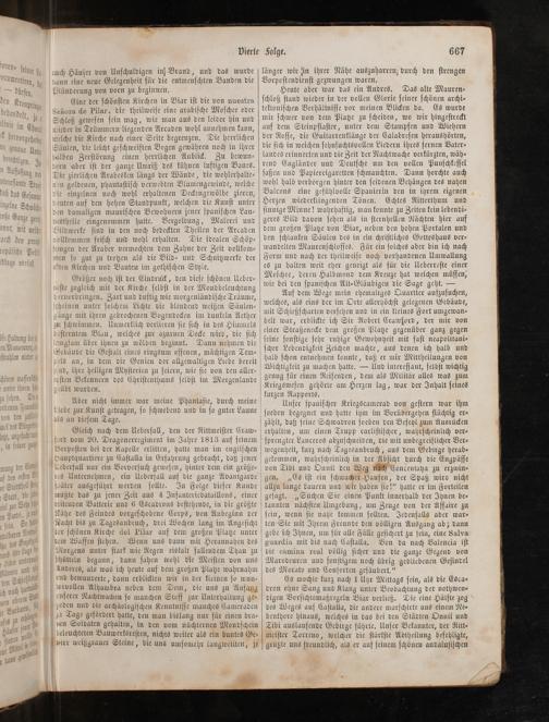 Auf dem Wege mein ehemaliges Quartier aufzuſuchen, welches, als eins der im Orte allerhöchſt gelegenen Gebäude, mit Schießſcharten verſehen und in ein kleines Fort umgewan⸗ belt war, erblickte ich Sir Robert Crawford, der mir von einer Straßenecke dem großen Platze gegenüber ganz gegen ſeine ſonſtige ſehr ruhige Gewohnheit mit faſt neapolitani⸗ ſcher Lebendigkeit Zeichen machte, aus denen ich halb und halb ſchon entnehmen konnte, daß er mir Mittheilungen von Wichtigkeit zu machen hatte.— Und intereſſant, ſelbſt wichtig genug für einen Reiſenden, dem als Militär alles was zum Kriegsweſen gehörte am Herzen lag, war der Inhalt ſeines kurzen Rapports.