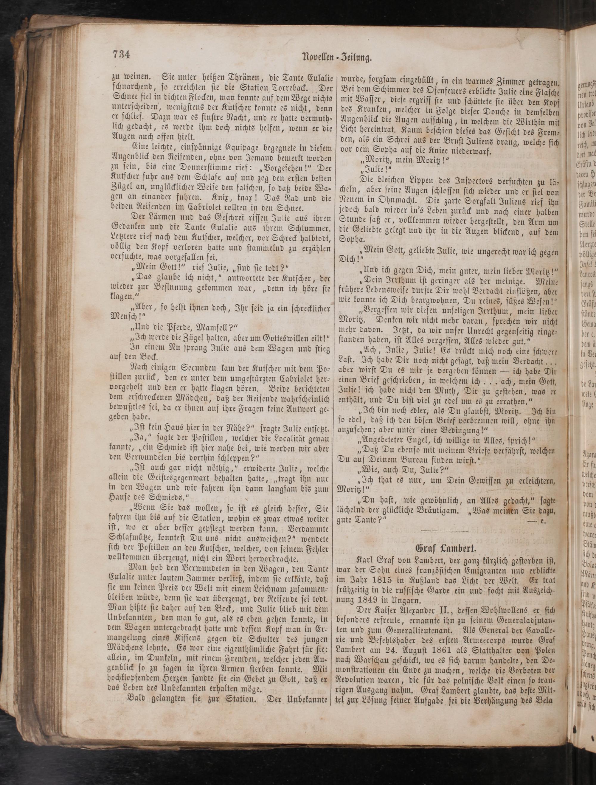 734 Novellen⸗Zeitung. zu weinen. Sie unter heißen Thränen, die Tante Eulalie wurde, ſorgſam eingehüllt, in ein warmes Zimmer getragen. gerunge ſchnarchend, ſo erreichten ſie die Station Torreback. Der Bei dem Schimmer des Ofenfeuers erblickte Julie eine Flaſche nen tro Schnee fiel in dichten Flocken, man konnte auf dem Wege nichts mit Waſſer, dieſe ergriff ſie und ſchüttete ſie über den Kopf Urlaub unterſcheiden, wenigſtens der Kutſcher konnte es nicht, denn des Kranken, welcher in Folge dieſer Douche in demſelben proviſot er ſchlief. Dazu war es finſtre Nacht, und er hatte vermuth⸗ Augenblick die Augen aufſchlug, in welchem die Wirthin mit von Pol lich gedacht, es werde ihm doch nichts helfen, wenn er die Licht hereintrat. Kaum beſchien dieſes das Geſicht des Frem— lich leid Augen auch offen hielt. den, als ein Schrei aus der Bruſt Juliens drang, welche ſich reich, unm Eine leichte, einſpännige Equipage begegnete in dieſem vor dem Sopha auf die Kniee niederwarf. dort mac Augenblick den Reiſenden, ohne von Jemand bemerkt worden„Moritz, mein Moritz!“ Gräfind zu ſein, bis eine Donnerſtimme rief:„Vorgeſehen!“ Der„Julie 1⸗ deren H Kutſcher fuhr aus dem Schlafe auf und zog den erſten beſten Die bleichen Lippen des Inſpectors verſuchten zu lä⸗ ſchlager Zügel an, unglücklicher Weiſe den falſchen, ſo daß beide Wa⸗ ſcheln, aber ſeine Augen ſchloſſen ſich wieder und er fiel von det Br gen an einander fuhren. Knix, knax! Das Rad und die Neuem in Ohnmacht. Die zarte Sorgfalt Juliens rief ihn Famil beiden Reiſenden im Cabriolet rollten in den Schnee. jedoch bald wieder in's Leben zurück und nach einer halben wurde Der Lärmen und das Geſchrei riſſen Julie aus ihren Stunde ſaß er, vollkommen wieder hergeſtellt, den Arm um Stelle Gedanken und die Tante Eulalie aus ihrem Schlummer. die Geliebte gelegt und ihr in die Augen blickend, auf dem ben ſei Letztere rief nach dem Kutſcher, welcher, vor Schreck halbtodt, Sopha. Aerzte völlig den Kopf verloren hatte und ſtammelnd zu erzählen„Mein Gott, geliebte Julie, wie ungerecht war ich gegen völlige verſuchte, was vorgefallen ſei. Dich!“ Inſel; „Mein Gott!“ rief Julie,„ſind ſie todt?“„Und ich gegen Dich, mein guter, mein lieber Moritz!“ 0s „Das glaube ich nicht,“ antwortete der Kutſcher, der„Dein Irrthum iſt geringer als der meinige. Meine wieder zur Beſinnung gekommen war,„denn ich höre ſie frühere Lebensweiſe durfte Dir wohl Verdacht einflößen, aber klagen.“ wie konnte ich Dich beargwohnen, Du reines, ſüßes Weſen!“ „Aber, ſo helft ihnen doch, Ihr ſeid ja ein ſchrecklicher„Vergeſſen wir dieſen unſeligen Irrthum, mein lieber Menſch!“ Moritz. Denken wir nicht mehr daran, ſprechen wir nicht „Und die Pferde, Mamſell?“ mehr davon. Jetzt, da wir unſer Unrecht gegenſeitig einge⸗ „Ich werde die Zügel halten, aber um Gotteswillen eilt!“ ſtanden haben, iſt Alles vergeſſen, Alles wieder gut.“ In einem Nu ſprang Julie aus dem Wagen und ſtieg„Ach, Julie, Julie! Es drückt mich noch eine ſchwere 4 auf den Bock. Laſt. Ich habe Dir noch nicht geſagt, daß mein Verdacht... ett Nach einigen Secunden kam der Kutſcher mit dem Po⸗ aber wirſt Du es mir je vergeben können— ich habe Dir ſtillon zurück, den er unter dem umgeſtürzten Cabriolet her⸗ einen Brief geſchrieben, in welchem ich... ach, mein Gott, Lau vorgeholt und den er hatte klagen hören. Beide berichteten Julie! ich habe nicht den Muth, Dir zu geſtehen, was er vete( dem erſchrockenen Mädchen, daß der Reiſende wahrſcheinlich enthält, und Du biſt viel zu edel um es zu errathen.“ linge bewußtlos ſei, da er ihnen auf ihre Fragen keine Antwort ge⸗„Ich bin noch edler, als Du glaubſt, Moritz. Ich bin 4 geben habe. ſo edel, daß ich den böſen Brief verbrennen will, ohne ihn „Iſt kein Haus hier in der Nähe?“ fragte Julie entſetzt. anzuſehen; aber unter einer Bedingung!“ „Ja,“ ſagte der Poſtillon, welcher die Localität genau„Angebeteter Engel, ich willige in Alles, ſprich!“ kannte,„ein Schmied iſt hier nahe bei, wie werden wir aber„Daß Du ebenſo mit meinem Briefe verfährſt, welchen Thara den Verwundeten bis dorthin ſchleppen?“ Du auf Deinem Bureau finden wirſt.“ Er fa „Iſt auch gar nicht nöthig,“ erwiderte Julie, welche„Wie, auch Du, Julie?“ welche allein die Geiſtesgegenwart behalten hatte,„tragt ihn nur„Ich that es nur, um Dein Gewiſſen zu erleichtern, vrrch in den Wagen und wir fahren ihn dann langſam bis zum Moritz!“ vom Hauſe des Schmieds.“.„Du haſt, wie gewöhnlich, an Alles gedacht,“ ſagte von! „Wenn Sie das wollen, ſo iſt es gleich beſſer, Sie lächelnd der glückliche Bräutigam.„Was meinen Sie dazu, nußt fahren ihn bis auf die Station, wohin es zwar etwas weiter gute Tante?“—e. eine, iſt, wo er aber beſſer gepflegt werden kann. Verdammte—— waren Schlafmütze, konnteſt Du uns nicht ausweichen?“ wendete Stäm ſich der Poſtillon an den Kutſcher, welcher, von ſeinem Fehler Graf Lambert. ſich d vollkommen überzeugt, nicht ein Wort hervorbrachte. Karl Graf von Lambert, der ganz kürzlich geſtorben iſt, Bolas 1 Man hob den Verwundeten in den Wagen, den Tante war der Sohn eines franzöſiſchen Emigranten und erblickte Män 1 Eulalie unter lautem Jammer verließ, indem ſie erkkärte, daß im Jahr 1815 in Rußland das Licht der Welt. Er trat und ſie um keinen Preis der Welt mit einem Leichnam zuſammen⸗ frühzeitig in die ruſſiſche Garde ein und focht mit Auszeich⸗ ſind v 1 bleiben würde, denn ſie war überzeugt, der Reiſende ſei todt. nung 1849 in Ungarn. 1 Pfänle 5 Man hißte ſie daher auf den Bock, und Julie blieb mit dem Der Kaiſer Alexander II., deſſen Wohlwollens er ſich Kuhhe 1 Unbekannten, den man ſo gut, als es eben gehen konnte, in beſonders erfreute, ernannte ihn zu ſeinem Generaladjutan⸗