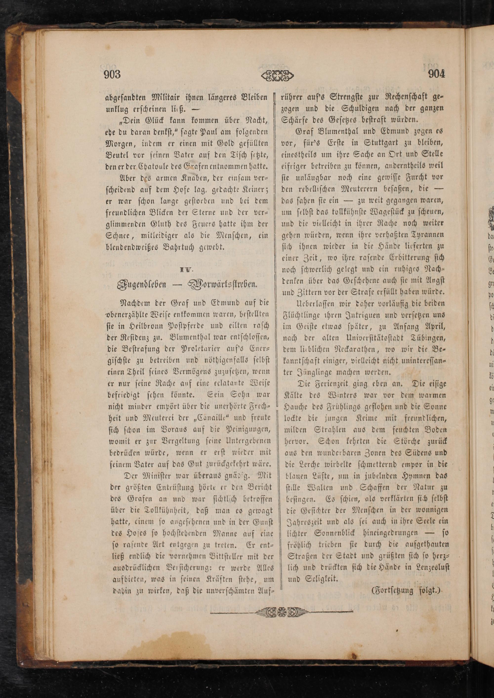 Nachdem der Graf und Edmund auf die obenerzählte Weiſe entkommen waren, beſtellten ſie in Heilbronn Poſtpferde und eilten raſch der Reſidenz zu. Blumenthal war entſchloſſen, die Beſtrafung der Proletarier auf's Ener⸗ giſchſte zu betreiben und nöthigenfalls ſelbſt einen Theil ſeines Vermögens zuzuſetzen, wenn er nur ſeine Rache auf eine eclatante Weiſe befriedigt ſehen könnte. Sohn nicht minder empört über die unerhörte Frech⸗ heit und Meuterei der„Canaille“ und freute ſich ſchon im Voraus auf die Peinigungen, womit er zur Vergeltung ſeine Untergebenen bedrücken würde, wenn er erſt wieder mit