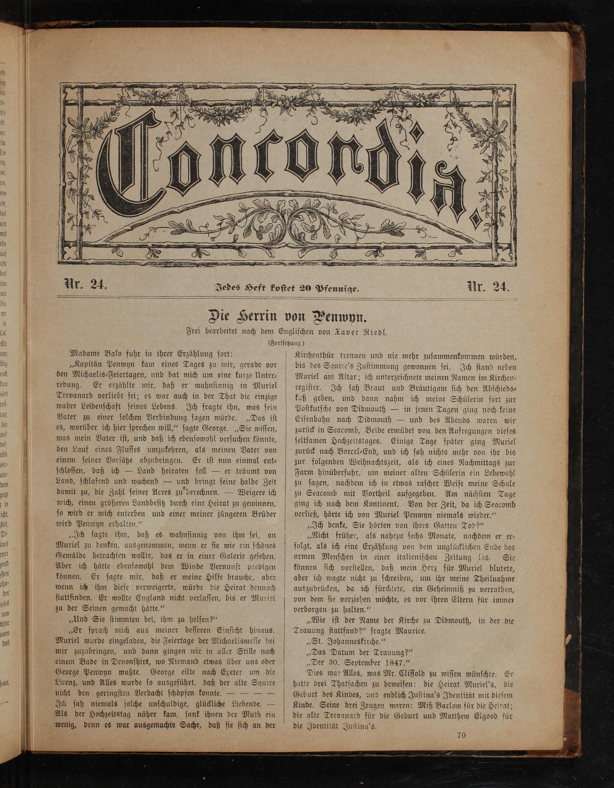 „Er ſprach mich aus meiner beſſeren Einſicht hinaus. Muriel wurde eingeladen, die Feiertage der Michaelismeeſſe bei mir zuzubringen, und dann gingen wir in aller Stille nach einem Bade in Devonſhire, wo Niemand etwas über uns oder George Penwyn wußte. George eilte nach Exeter um die Licenz, und Alles wurde ſo ausgeführt, daß der alte Squire nicht den geringſten Verdacht ſchöpfen konnte———— Ich ſah niemals ſolche unſchuldige, glückliche Liebende.— Als der Hochzeitstag näher kam, ſank ihnen der Muth ein