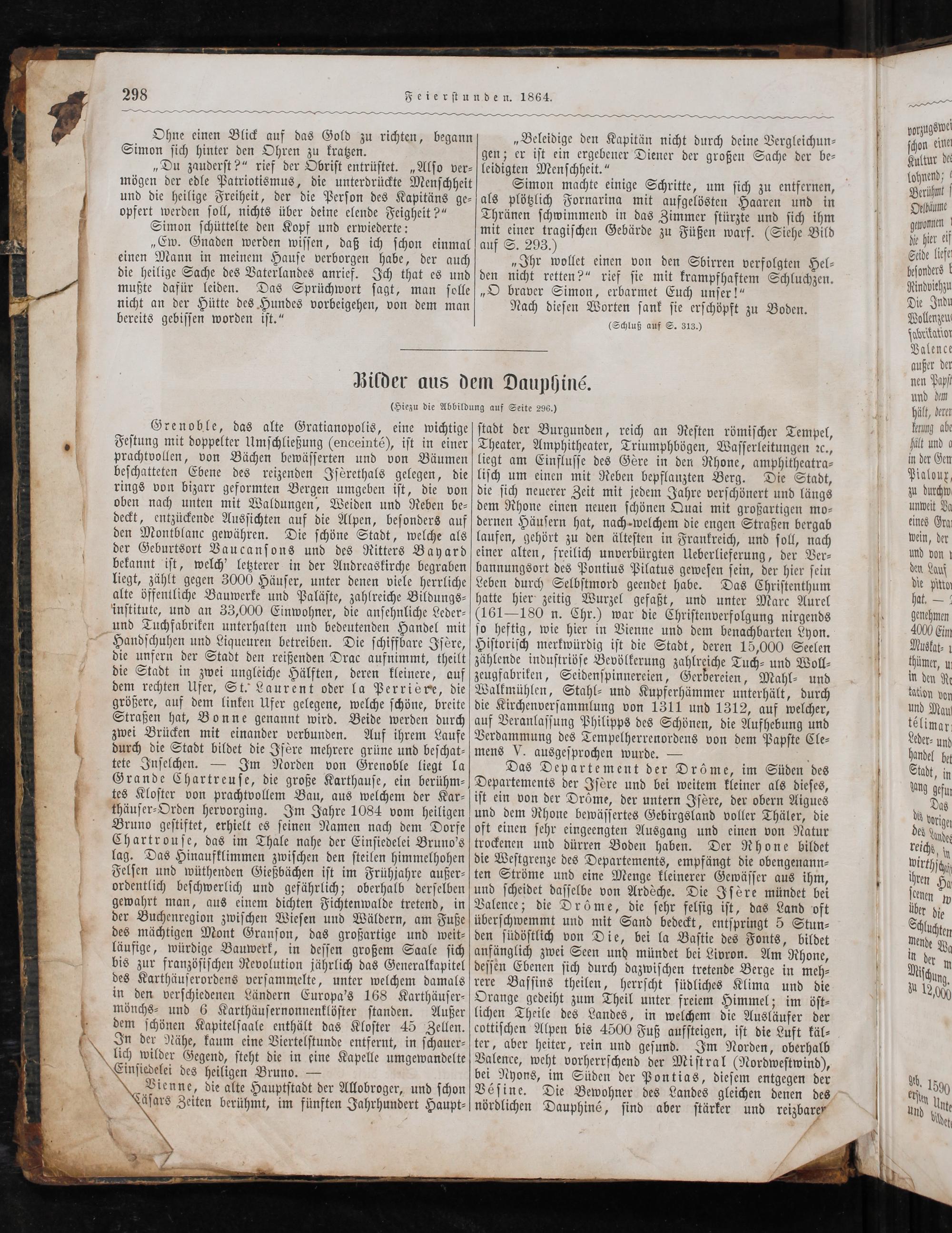 Grenoble, das alte Gratianopolis, eine wichtige Feſtung mit doppelter Umſchließung(enceinté), iſt in einer prachtvollen, von Bächen bewäſſerten und von Bäumen beſchatteten Ebene des reizenden Iſorethals gelegen, die rings von bizarr geformten Bergen umgeben iſt, die von oben nach unten mit Waldungen, Weiden und Reben be⸗ deckt, entzückende Ausſichten auf die Alpen, beſonders auf den Montblanc gewähren. Die ſchöne Stadt, welche als der Geburtsort Vaucanſons und des Ritters Bayard bekannt iſt, welch' letzterer in der Andreaskirche begraben liegt, zählt gegen 3000 Häuſer, unter denen viele herrliche alte öffentliche Bauwerke und Paläſte, zahlreiche Bildungs⸗ inſtitute, und an 33,000 Einwohner, die anſehnliche Leder⸗ und Tuchfabriken unterhalten und bedeutenden Handel mit — Handſchuhen und Liqueuren betreiben. Die ſchiffbare Iſere, die unfern der Stadt den reißenden Drac aufnimmt, theilt die Stadt in zwei ungleiche Hälften, deren kleinere, auf dem rechten Ufer, St. Laurent oder la Perrisre, die größere, auf dem linken Ufer gelegene, welche ſchöne, breite Straßen hat, Bonne genannt wird. Beide werden durch zwei Brücken mit einander verbunden. Auf ihrem Laufe durch die Stadt bildet die Iſère mehrere grüne und beſchat⸗ tete Inſelchen.— Im Norden von Grenoble liegt la Grande Chartreuſe, die große Karthauſe, ein berühm— tes Kloſter von prachtvollem Bau, aus welchem der Kar⸗ thäuſer⸗Orden hervorging. Im Jahre 1084 vom heiligen Bruno geſtiftet, erhielt es ſeinen Namen nach dem Dorfe Chartrouſe, das im Thale nahe der Einſiedelei Bruno's lag. Das Hinaufklimmen zwiſchen den ſteilen himmelhohen Felſen und wüthenden Gießbächen iſt im Frühjahre außer⸗ ordentlich beſchwerlich und gefährlich; oberhalb derſelben gewahrt man, aus einem dichten Fichtenwalde tretend, in der Buchenregion zwiſchen Wieſen und Wäldern, am Fuße des mächtigen Mont Granſon, das großartige und weit⸗ läufige, würdige Bauwerk, in deſſen großem Saale ſich bis zur franzöſiſchen Revolution jährlich das Generalkapitel des Karthäuſerordens verſammelte, unter welchem damals in den verſchiedenen Ländern Europa's 168 Karthäuſer⸗ mönchs⸗ und 6 Karthäuſernonnenklöſter ſtanden. Außer dem ſchönen Kapitelſaale enthält das Kloſter 45 Zellen. In der Nähe, kaum eine Viertelſtunde entfernt, in ſchauer⸗ lich wilder Gegend, ſteht die in eine Kapelle umgewandelte Eiiſiedelei des heiligen Bruno.—