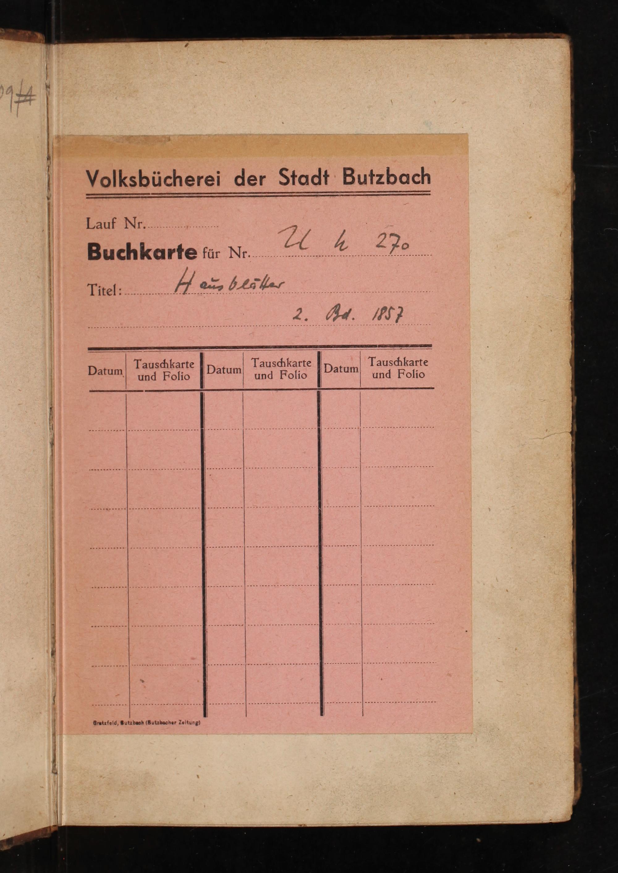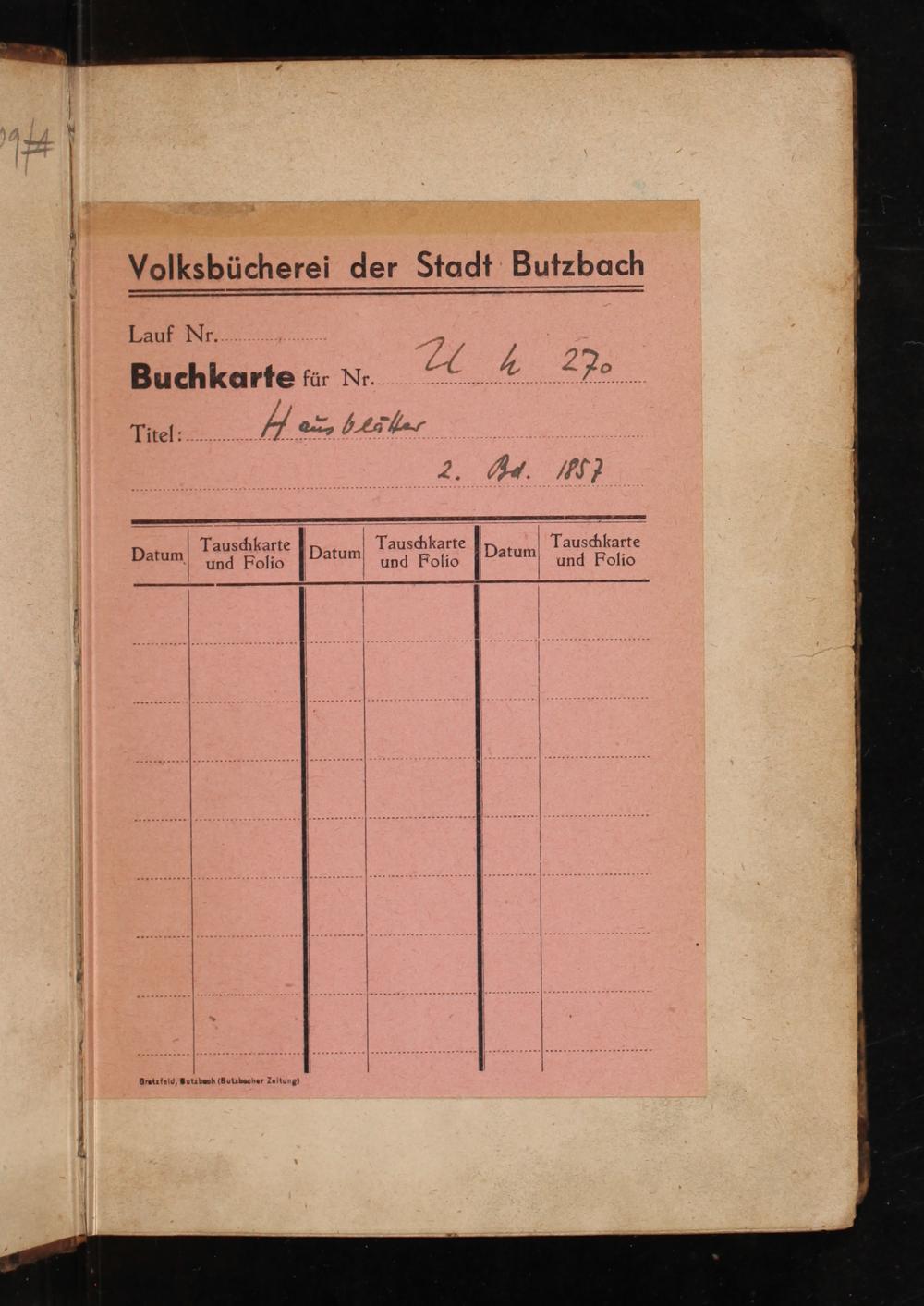 Buchkartfe für Nr A ee Tnel- A eer at eeedene he e 2. Ar. MM⸗