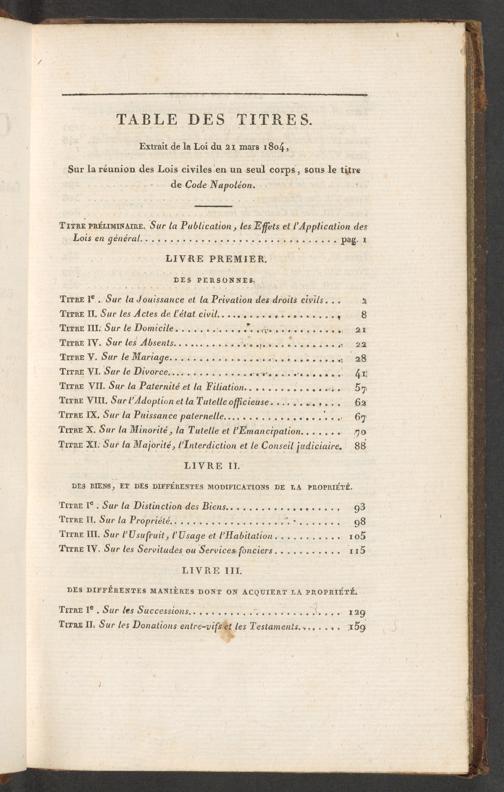 Tire L°: Sur la Distinctiondes Biens.............,...., 03 Titre I. Sur la Propriété......... di ecnres it duos OÙ Tree U. Sur PUsufruit, l'Usage et l'Habitation.......“ee[00 Tire 1V. Sur les Servitudes ou Services fonciers........... 115