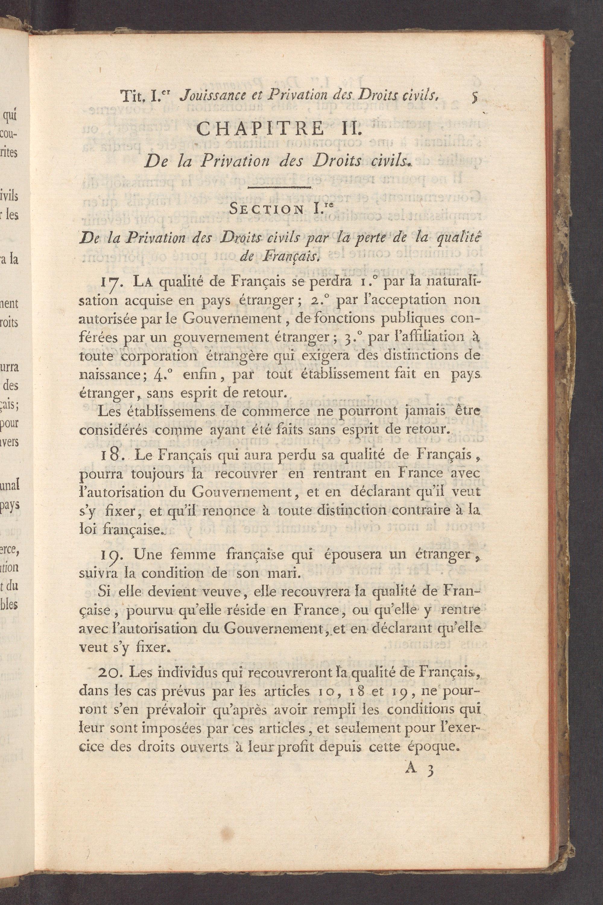 . LA qualité de Français se perdra 1.° par la nr sation acquise en pays étranger; 2.° par lacceptation non autorisée par le Gouvernement, de fonctions publiques con- férées par un gouvernement étranger; 3.° par laffiliation à toute corporation étrangère qui exigera dés distinctions de naissance; 4.° enfin, par tout om fait en pays étranger, sans esprit de retour.