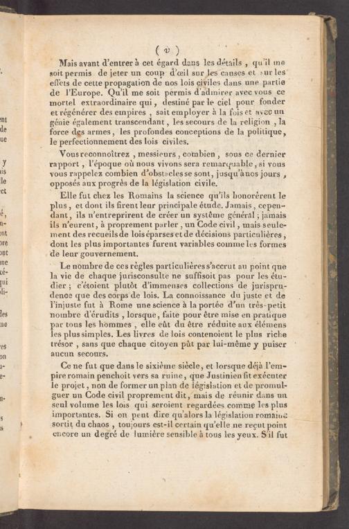 Ce ne fut que dans le sixième siècle, et lorsque djà l'em- pire romain penchoit vers sa ruine, que Justinien ſit exécuter le projet, non de former un plan de légisiation et de promul- guer un Code civil proprement dit, mais de réunir dans un seul volume les lois qui seroient regardées comme les plus importantes. Si on peut dire qu'alors la législation romaiue sortit du chaos, toujours est-il certain qu'elle ne regut point encore un degré de lumière sensible à tous les yeux. Sil fut