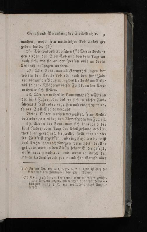 26. Die contradictoriſchen(*) Verurtheilun⸗ gen zieden den Civil⸗Tod nur don dem Tage an nach ſich, wo ſie an der Perſon oder an deren Bildniß vollzogen werden⸗