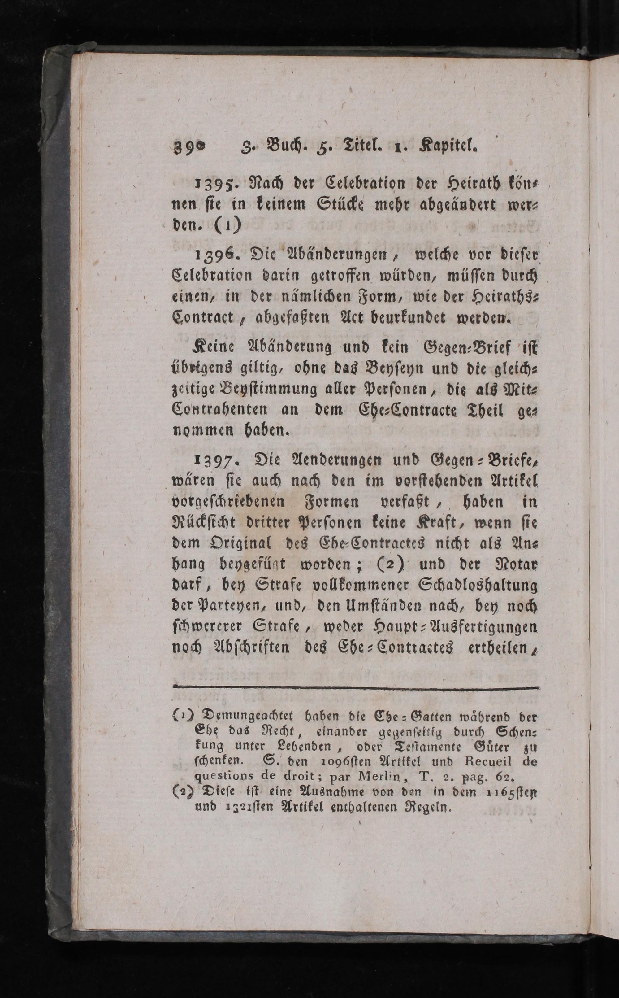 1397. Die Aenderungen und Gegen⸗Briefe, wären ſie auch nach den im vorſtehenden Artikel vorgeſchriebenen Formen verfaßt, haben in Rückſicht dritter Perſonen keine Kraft, wenn ſie dem Original des Ehe⸗Contractes nicht als An⸗ hang beygefünt worden;(2) und der Notar darf, bey Strafe vollkommener Schadloshaltung der Parteyen, und, den Umſtänden nach, bey noch ſchwererer Strafe, weder Haupt⸗Ausfertigungen noch Abſchriften des Ehe⸗Contractes ertheilen,