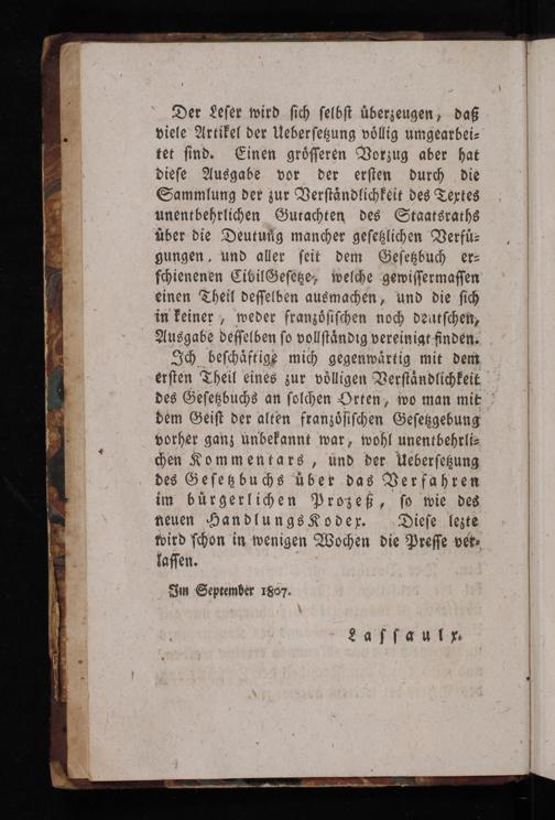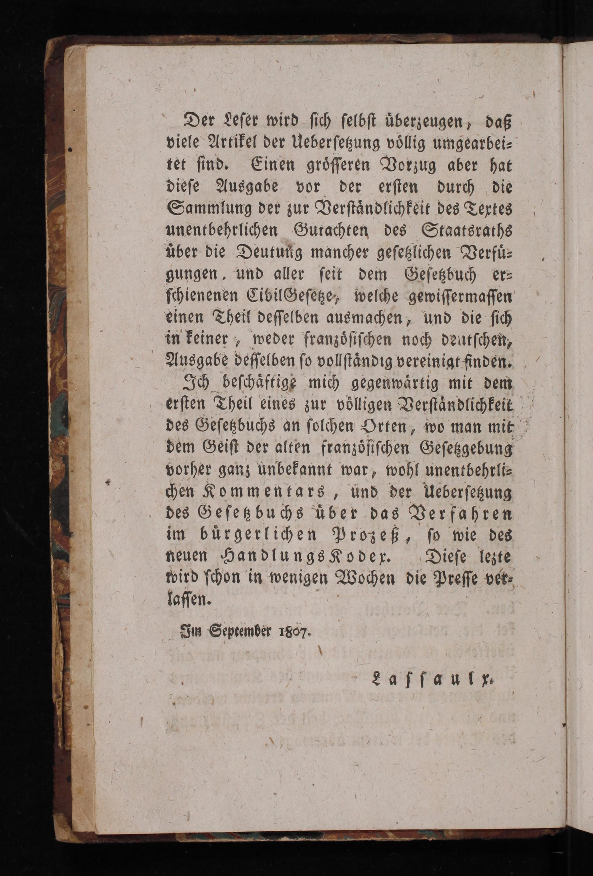Der Leſer wird ſich ſelbſt uͤberzeugen, daß viele Artikel der Ueberſetzung voͤllig umgearbei⸗ tet ſind. Einen groͤſſeren Vorzug aber hat dieſe Ausgabe vor der erſten durch die Sammlung der zur Verſtaͤndlichkeit des Textes unentbehrlichen Gutachten des Staatsraths über die Deutung mancher geſetzlichen Verfuͤ⸗ gungen, und aller ſeit dem Geſetzbuch er⸗ ſchienenen CibilGeſetze, welche gewiſſermaſſen einen Theil deſſelben ausmachen, und die ſich in keiner, weder franzoͤſiſchen noch deutſchen, Ausgabe deſſelben ſo vollſtaͤndig vereinigt finden.