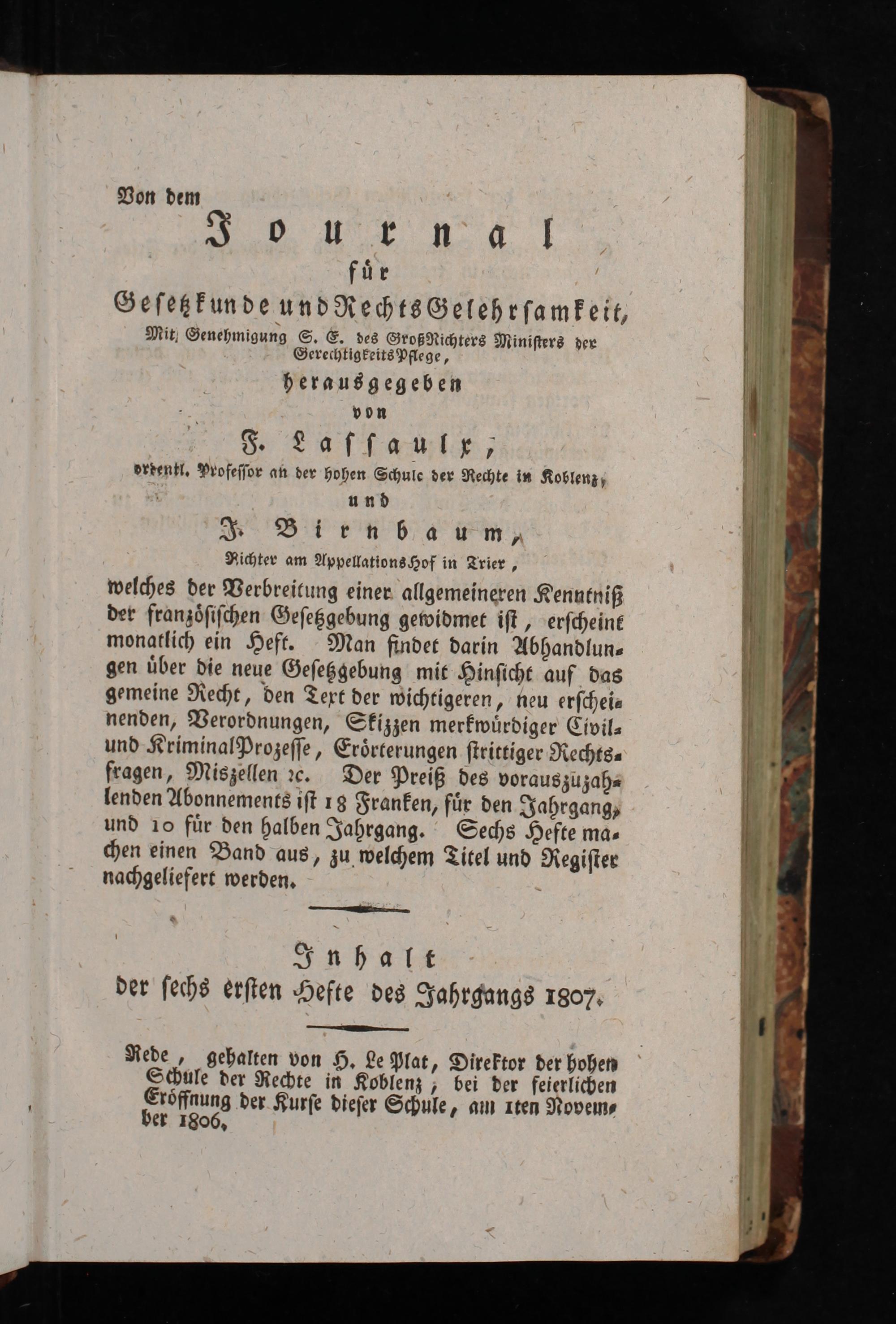 Rede, gehalten von H. Le Plat, Direktor der hohen Schule der Rechte in Koblenz, bei der feierlichen