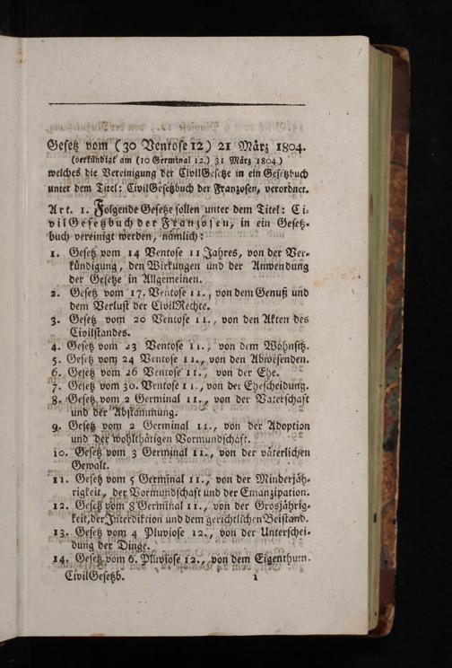 Art. 1. Folgende Geſetze ſollen unter dem Titel: Ci⸗ vilGeſetzbuchder Ftanzöſen, in ein Geſeß· buch vereinigt werden, nämlich: