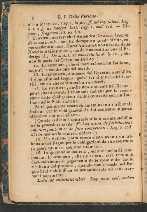 15. Un Italianio potrà essere citato avanti un tri- bunale del Regno per le obbligazioni da esso contratte in paese straniero con uno straniero.