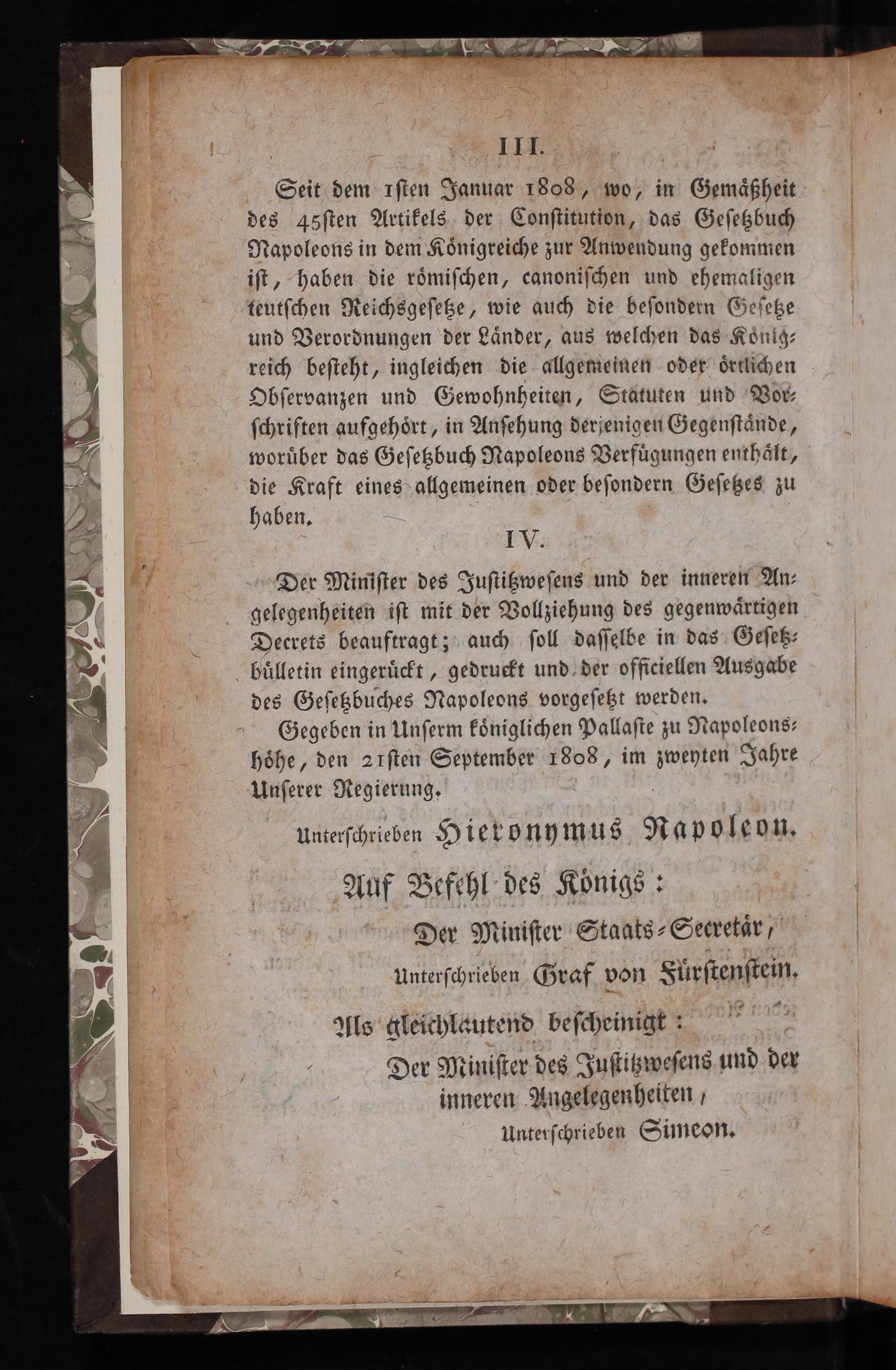 Der Miniſter des Juſtitzweſens und der inneren An⸗ gelegenheiten iſt mit der Vollziehung des gegenwaͤrtigen Decrets beauftragt; auch ſoll daſſelbe in das Geſetz⸗ bulletin eingeruͤckt, gedruckt und der officiellen Ausgabe des Geſetzbuches Napoleons vorgeſetzt werden. Gegeben in Unſerm koͤniglichen Pallaſte zu Napoleons⸗ hohe, den arſten September 1808, im zweyten Jahre Unſerer Regierung.