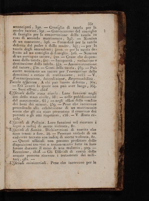 Ufficiali dello stato civile. Loro funzioni negli atti dello staco civile, 38;— nelle pubblicazioni del matrimonio, 63;— negli affissi delle vendite dei beni dei minori, 459.— Pene che incorrono procedendo alla celebr azione di un matrimonio senza che gli sia stato presentato il consenso dei parenti o gli atti rispettosi, 156.— V. Stato ci- vile.