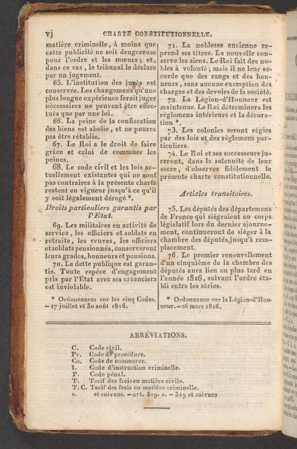 71. La noblesse ancienne re- prend ses titres. La nouvelle con- serve les siens. Le Roi fait des no- bles à volonté; mais il ne leur ac- corde que des rangs et des hon- neurs, sans aucune exemption des charges et des devoirs de la société.