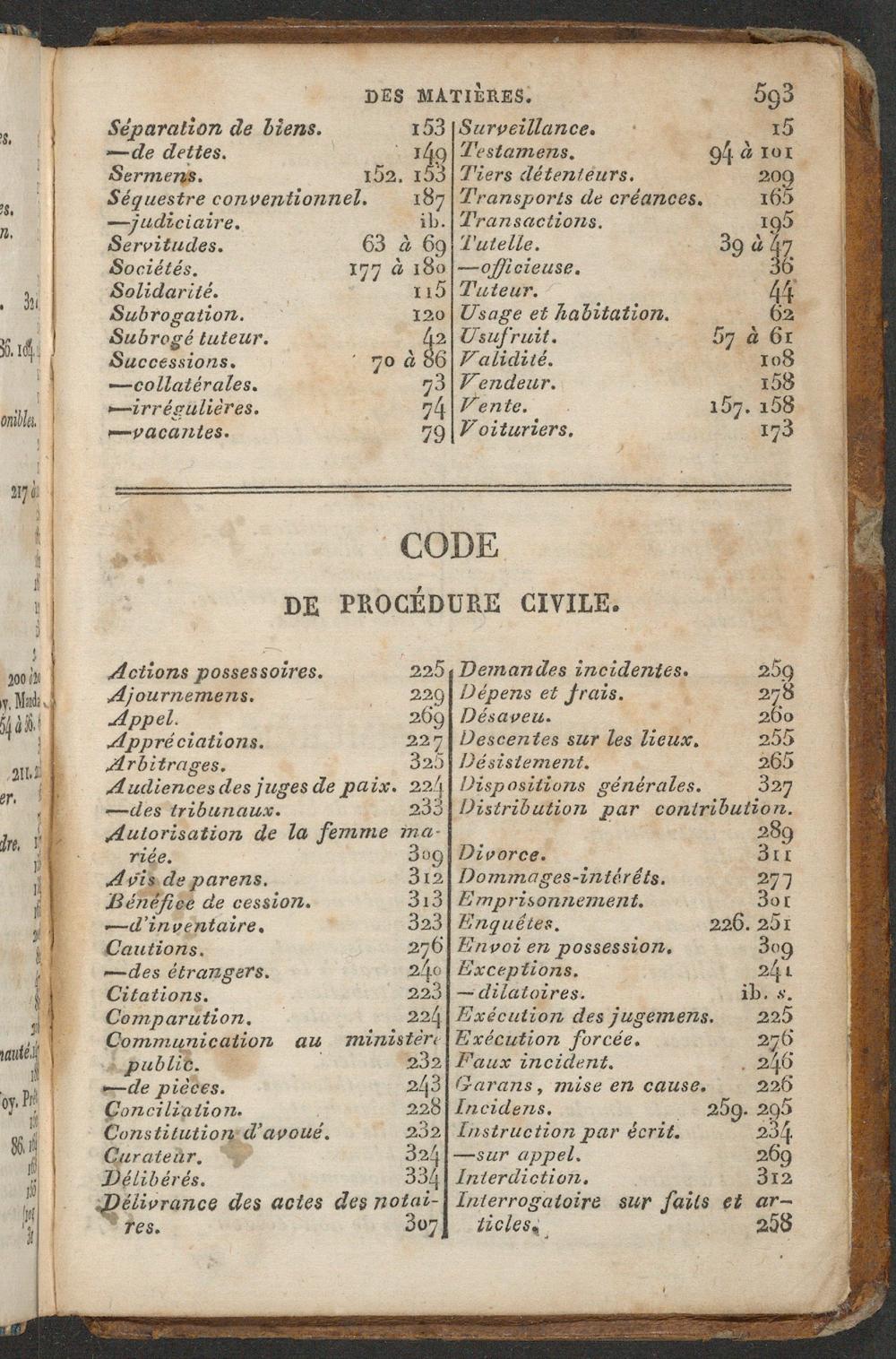 Séparation de biens. 153 Surveillance.: 15 —de deties.: 40] T'estamens. 94 à 107 Sermenis. 192, 193| Tiers détenteurs. 20! Séquestre conventionnel. 187| Transports de créances. 16 —judiciaire. ib.| Transactions. 199 Servitudes. 63 à 69|l'utelle. 39 24 Sociétés. 197 à 180|—oficieuse. 36 Solidarité. 119| Tuteur. a Subrogation. 120| Usage et habitation. 2. Subrogé tuteur. 2| Usufruit. 57 à 6x Successions. 70 à 66| J’alidité. 108 —collatérales. 73| Vendeur. 158 irrégulières. 54| Vente. 157. 158 =pAcariles. 79| V’oituriers, 173 4 CODE