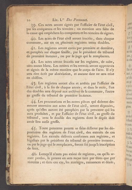 42. Les actes seront inscrits sur les registres, de suite, sans aucun blanc. Les ratures et les renvois seront appronvés et signés de la même manière que le corps de Pacte. Il n'y sera rien écrit par abrNIAtIOn, et aucune date ne sera mise en chiffres.