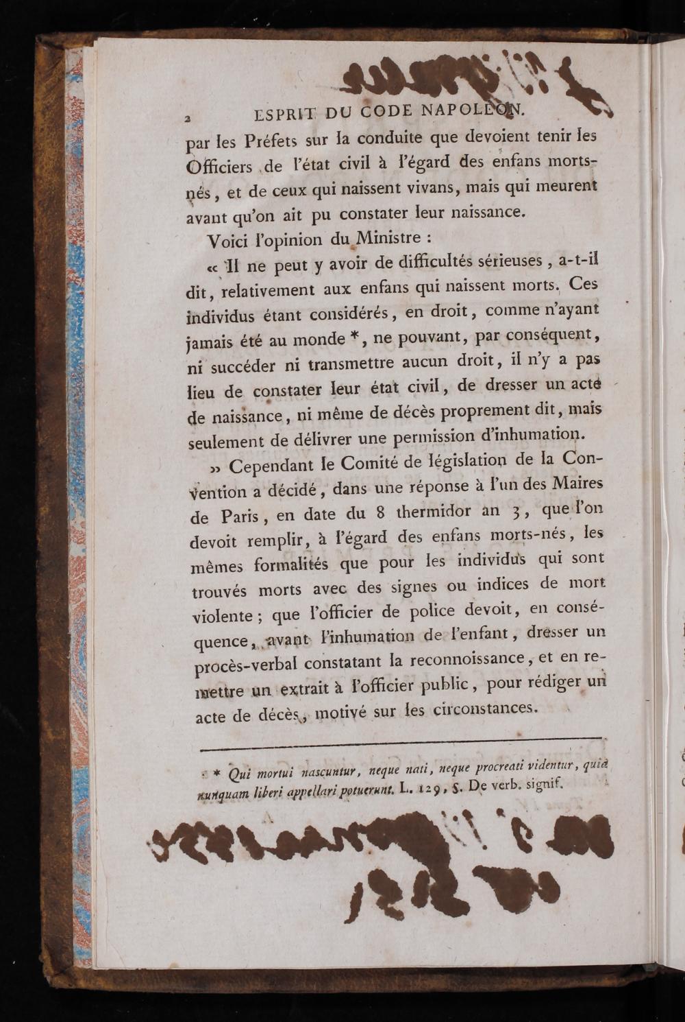 : LSPRIT DU CODE NAPOLË par les Préfets sur la conduite que devoient tenir Îles Officiers.de l'état civil à l'égard des enfans morts- nés, et de ceux qui naissent vivans, mais qui meurent avant qu’on ait pu constater leur naissance.