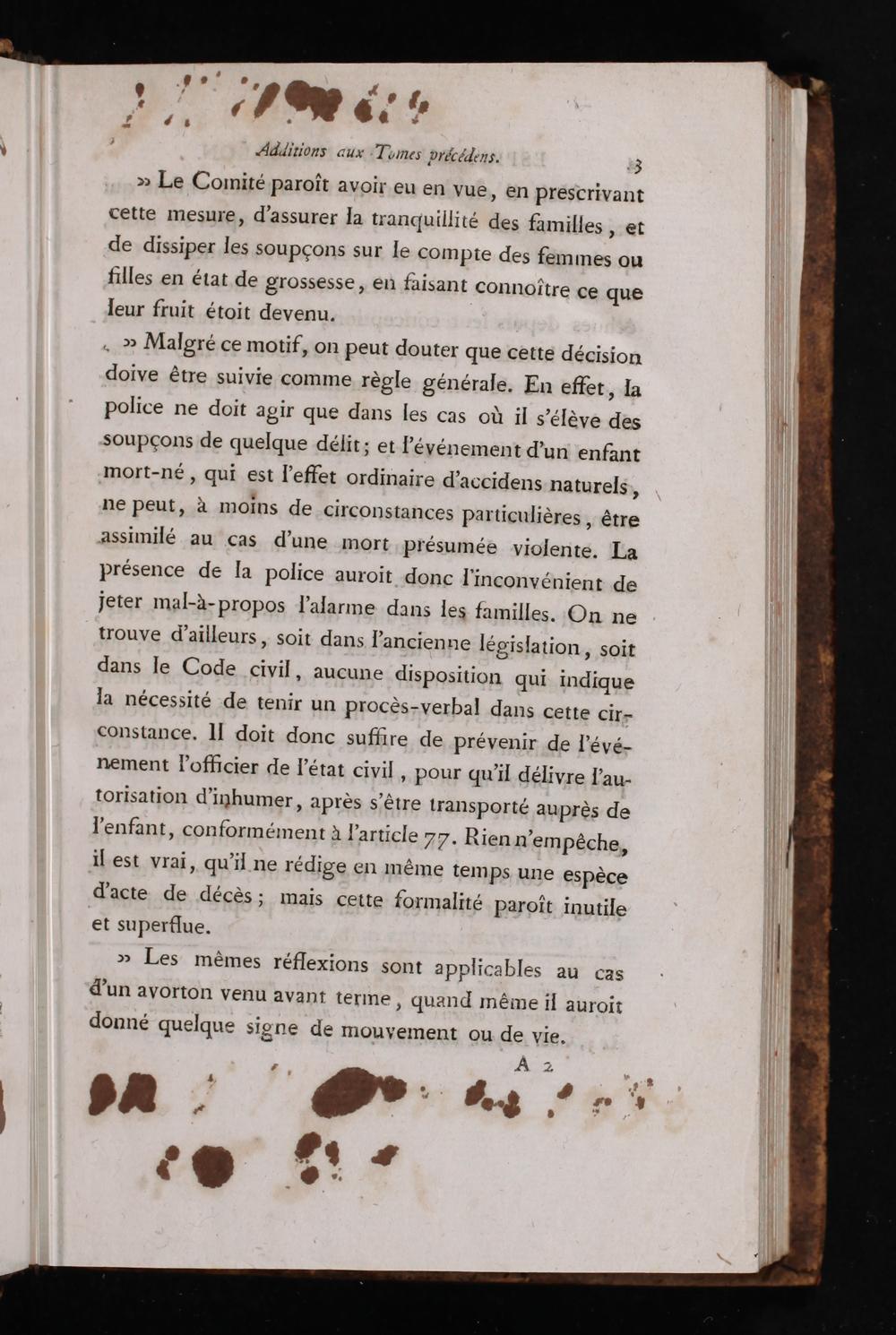 » Le Comité paroît avoir eu en vue, en prescrivant cette mesure, d'assurer la tranquillité des familles» et de dissiper les soupçons sur le compte des femmes ou filles en état de grossesse, en faisant connoître ce que leur fruit étoit devenu.