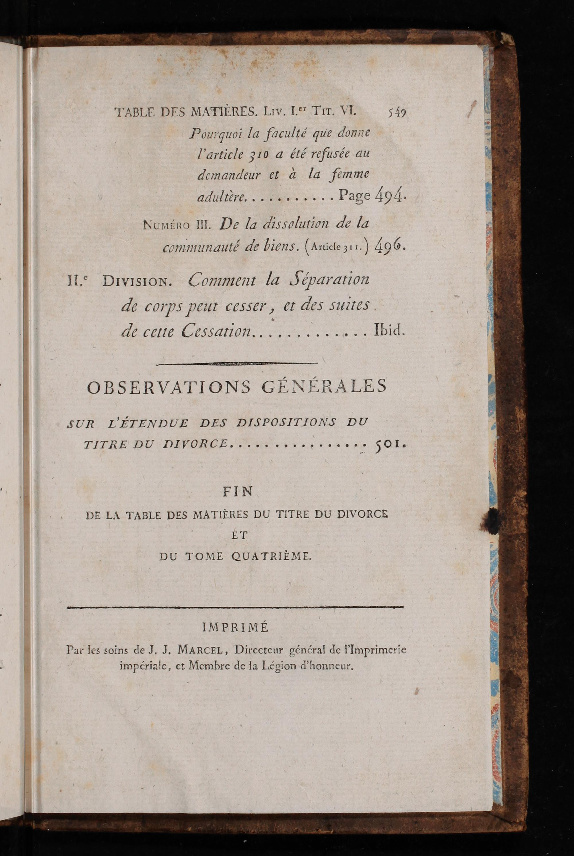 TITRE DUXDIMORCE Re der eee ss. SOI. FIN DE LA TABLE DES MATIÈRES DU TITRE DU DIVORCE EL