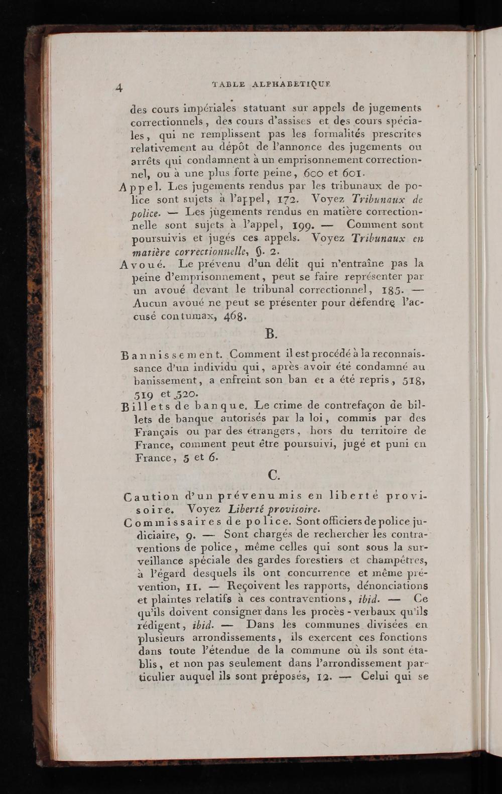 Appel. Lies jugements rendus par les tribunaux de po- lice sont sujets à l'appel, 172. Voyez Tribunaux de police.— Les jugements rendus en matière correction- nelle sont sujets à l’appel, 199.— Comment sont poursuivis et jugés ces appels. Voyez Tribunaux en matière correctionnelle,(. 2.
