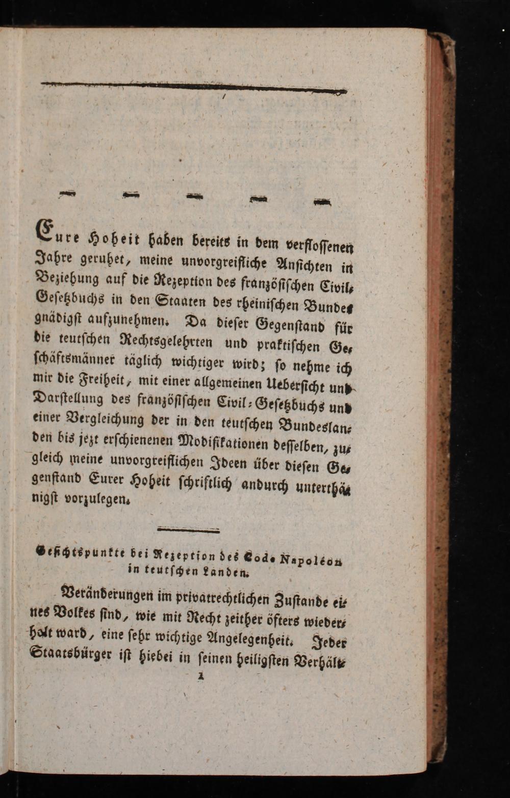 Eure Hobeit haben bereits in dem verfloſſenen Jahre geruhet, meine unvorgreifliche Anſichten in Beziehung auf die Rezeption des franzöſiſchen Civil⸗ Geſetzbuchs in den Staaten des rbeiniſchen Bundes 9nädigſt aufzunehmen. Da dieſer Gegenſtand für die teutſchen Rechtsgelehrten und praktiſchen Ge⸗ ſchäftsmänner täglich wichtiger wirdz ſo nehme ich mir die Freiheit, mit einer allgemeinen Ueberſicht unh Darſtellung des franzöſiſchen Civil⸗ Geſetzbuchs und einer Vergleichung der in den teutſchen Bundeslan⸗ den bis jezt erſchienenen Modiſikationen deſſelben, zu⸗ gleich meine unvorgteiflichen Ideen über dieſen Ge⸗