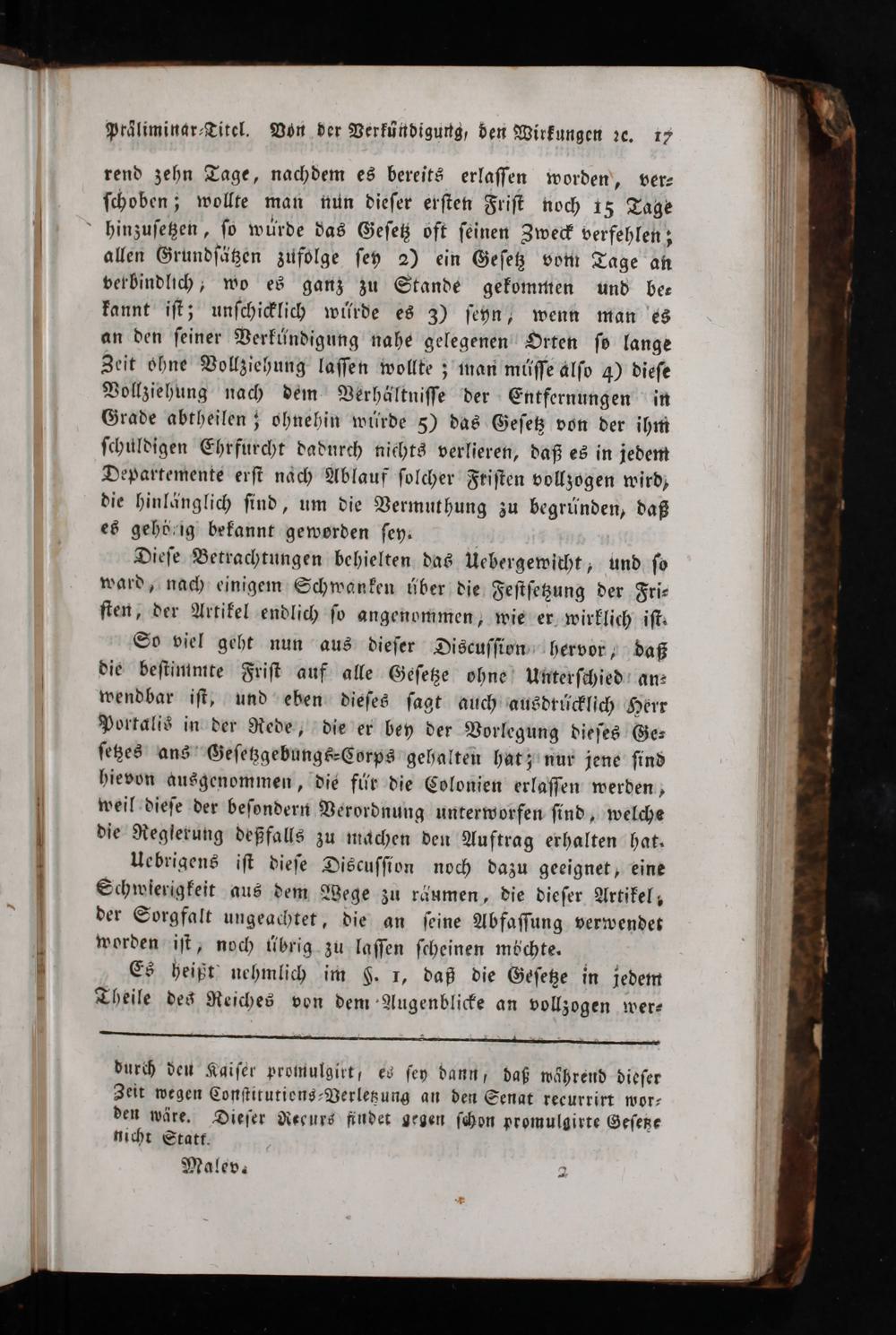 So viel geht nun aus dieſer Discuſſion hervor, daß die beſtimmte Friſt auf alle Geſetze ohne Unterſchied an⸗ wendbar iſt, und eben dieſes ſagt auch ausdrücklich Herr Portalis in der Rede, die er bey der Vorlegung dieſes Ge⸗ ſetzes ans Geſetzgebungs⸗Corps gehalten hat; nur jene ſind hievon ausgenommen, dié für die Colonien erlaſſen werden, weil dieſe der beſondern Verordnung unterworfen ſind, welche die Reglerung deßfalls zu machen den Auftrag erhalten hat.