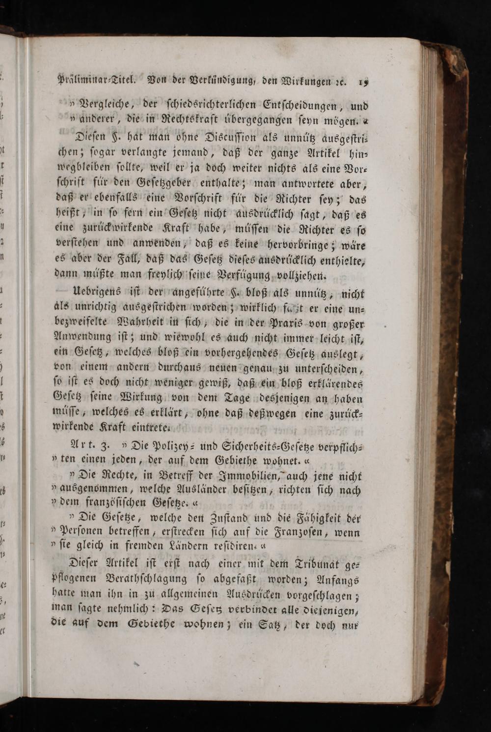 Dieſen F. hat man ohne Discuſſion als unnütz ausgeſtri⸗ chen; ſogar verlangte jemand, daß der ganze Artikel hin⸗ wegbleiben ſollte, weil er ja doch weiter nichts als eine Vor⸗ ſchrift für den Geſetzgeber enthalte; man antwortete aber, daß er ebenfalls eine Vorſchrift für die Richter ſey; das heißt, in ſo fern ein Geſetz nicht ausdrücklich ſagt, daß es eine zurückwirkende Kraft habe, müſſen die Richter es ſo verſtehen und anwenden, daß es keine hervorbringe; wäre es aber der Fall, daß das Geſetz dieſes ausdrücklich enthielte, dann müßte man freylich ſeine Verfügung vollziehen.