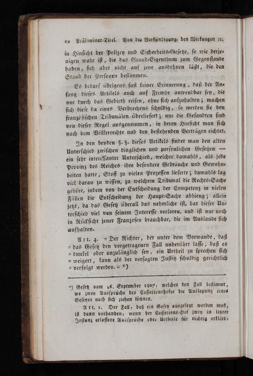 Art. 4.„Der Richter, der unter dem Vorwande, daß „das Geſetz den vorgetragenen Fall unberührt laſſe, daß es „dunkel oder unzulänglich ſey, ein Urtheil zu ſprechen ſich „weigert, kann als der verſagten Juſtitz ſchuldig gerichtlich
