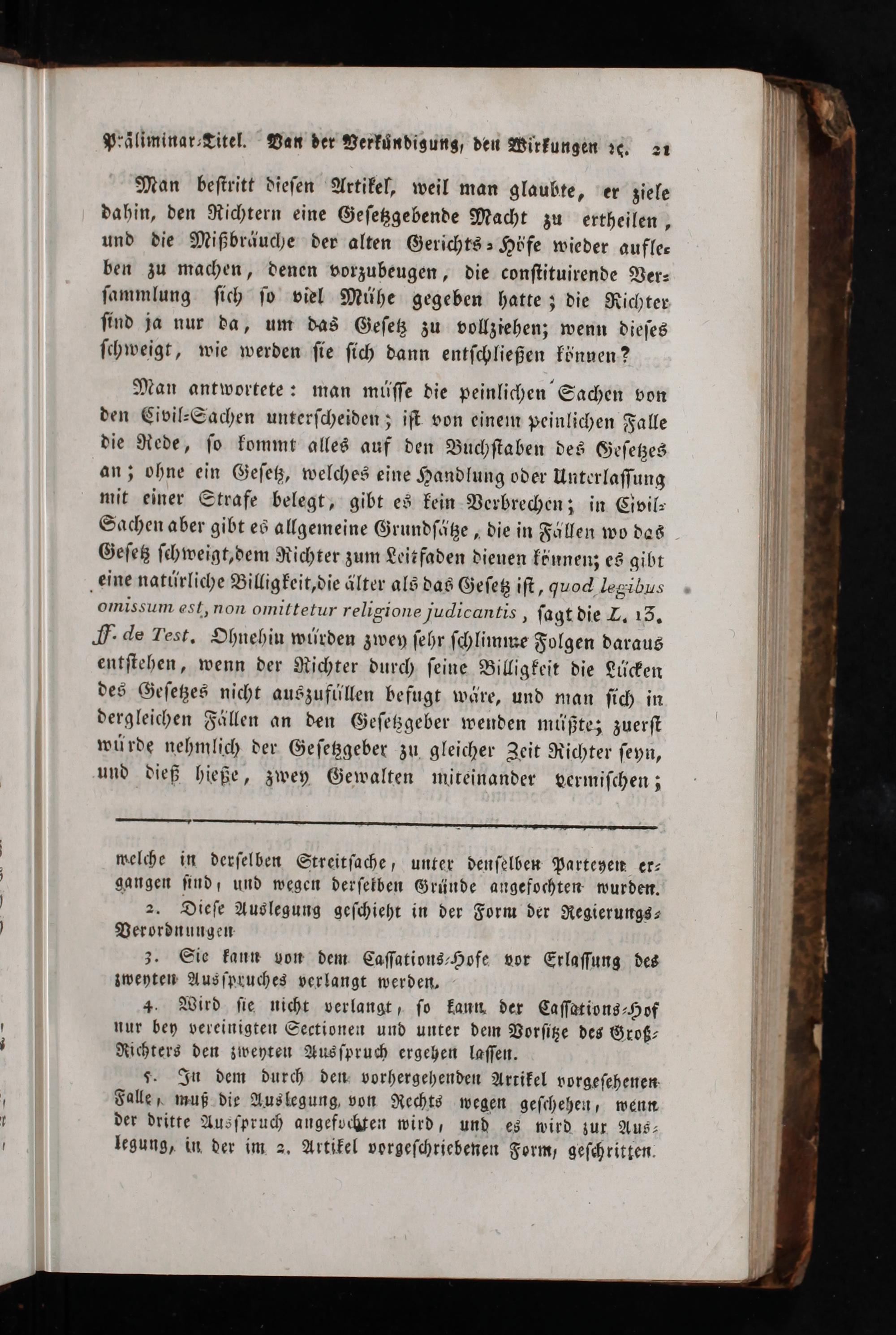 Man antwortete: man müſſe die peinlichen Sachen von den Civil⸗Sachen unterſcheiden; iſt von einem peinlichen Falle die Rede, ſo kommt alles auf den Buchſtaben des Geſetzes an; ohne ein Geſetz, welches eine Handlung oder Unterlaſſung mit einer Strafe belegt, gibt es kein Verbrechen; in Civil⸗ Sachen aber gibt es allgemeine Grundſätze, die in Fällen wo das Geſetz ſchweigt,dem Richter zum Leitfaden dienen könnenz es gibt