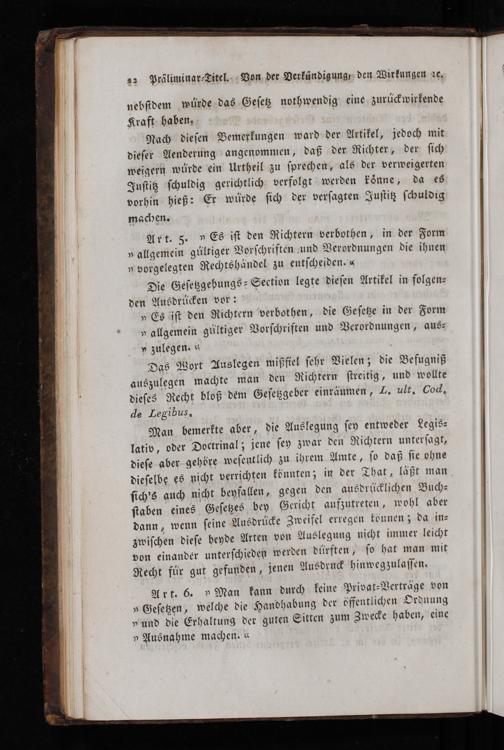 Man bemerkte aber, die Auslegung ſey entweder Legis⸗ lativ, oder Doctrinal; jene ſey zwar den Richtern unterſagt, dieſe aber gehöre weſentlich zu ihrem Amte, ſo daß ſie ohne dieſelbe es nicht verrichten könnten; in der That, läßt man ſich's auch nicht beyfallen, gegen den ausdrücklichen Buch⸗ ſtaben eines Geſetzes bey Gericht aufzutreten, wohl aber dann, wenn ſeine Ausdrücke Zweifel erregen können; da in⸗ zwiſchen dieſe beyde Arten von Auslegung nicht immer leicht von einander unterſchieden werden dürften, ſo hat man mit Recht für gut gefunden, jenen Ausdruck hinwegzulaſſen⸗