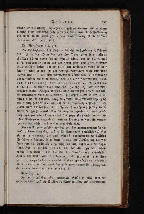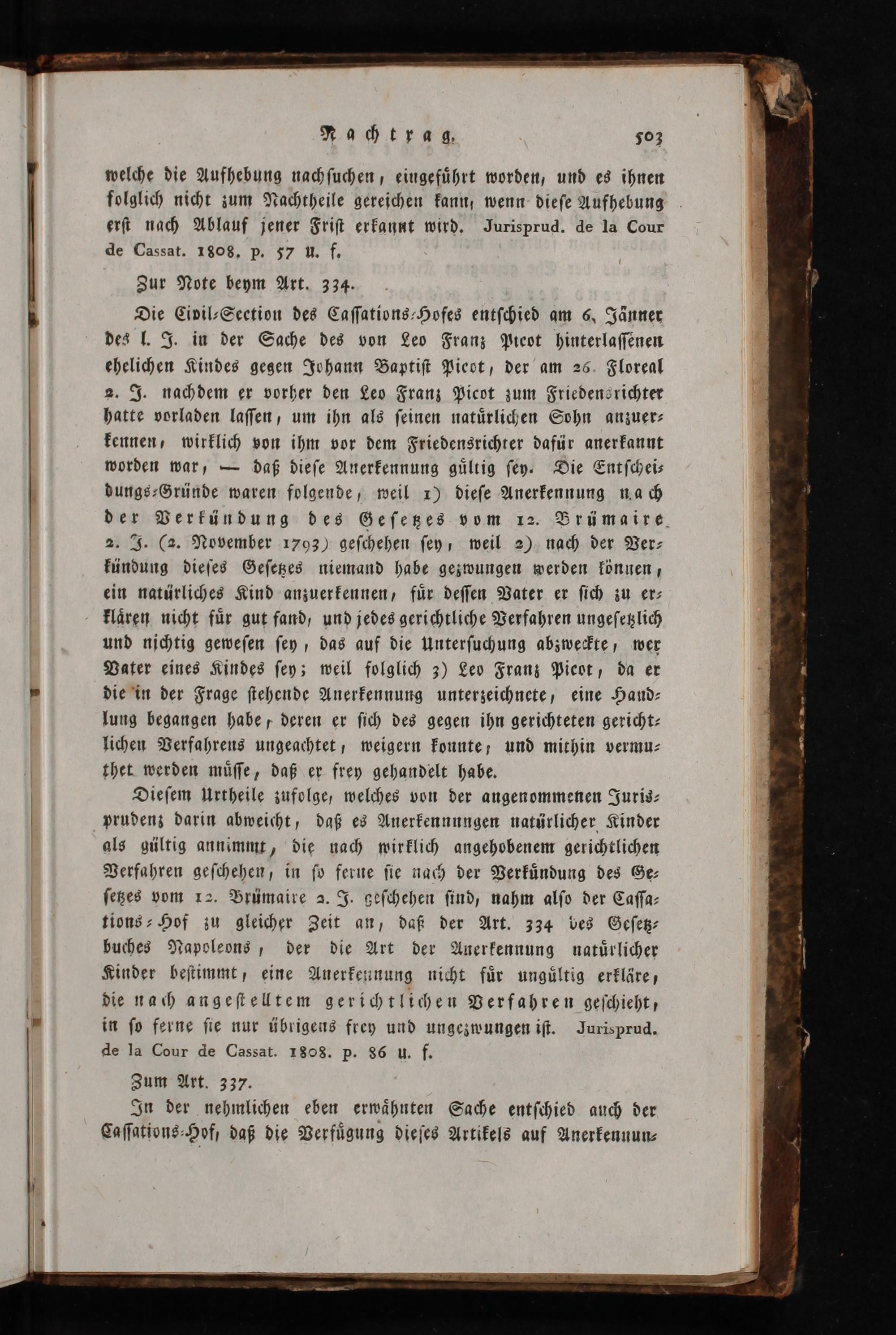 Dieſem Urtheile zufolge, welches von der angenommenen Juris⸗ prudenz darin abweicht, daß es Anerkennnngen natürlicher Kinder als gültig annimmt, die nach wirklich angehobenem gerichtlichen Verfahren geſchehen, in ſo ferue ſie nach der Verkuͤndung des Ge⸗ ſetzes vom 12. Prümaire 2. J. Leſchehen ſind, nahm alſo der Caſſa⸗ tions⸗Hof zu gleicher Zeit an, daß der Art. 334 bes Geſetz⸗ buches Napolevns, der die Art der Anerkennung natuͤrlicher Kinder beſtimmt, eine Anerkennung nicht fuͤr ungultig erkläre, die nach angeſtelltem gerichtlichen Verfahren geſchieht, in ſo ferne ſie nur übrigens frey und ungezwungen iſt. Jurisprud. de la Cour de Cassat. 1808. p. 86 u. f.