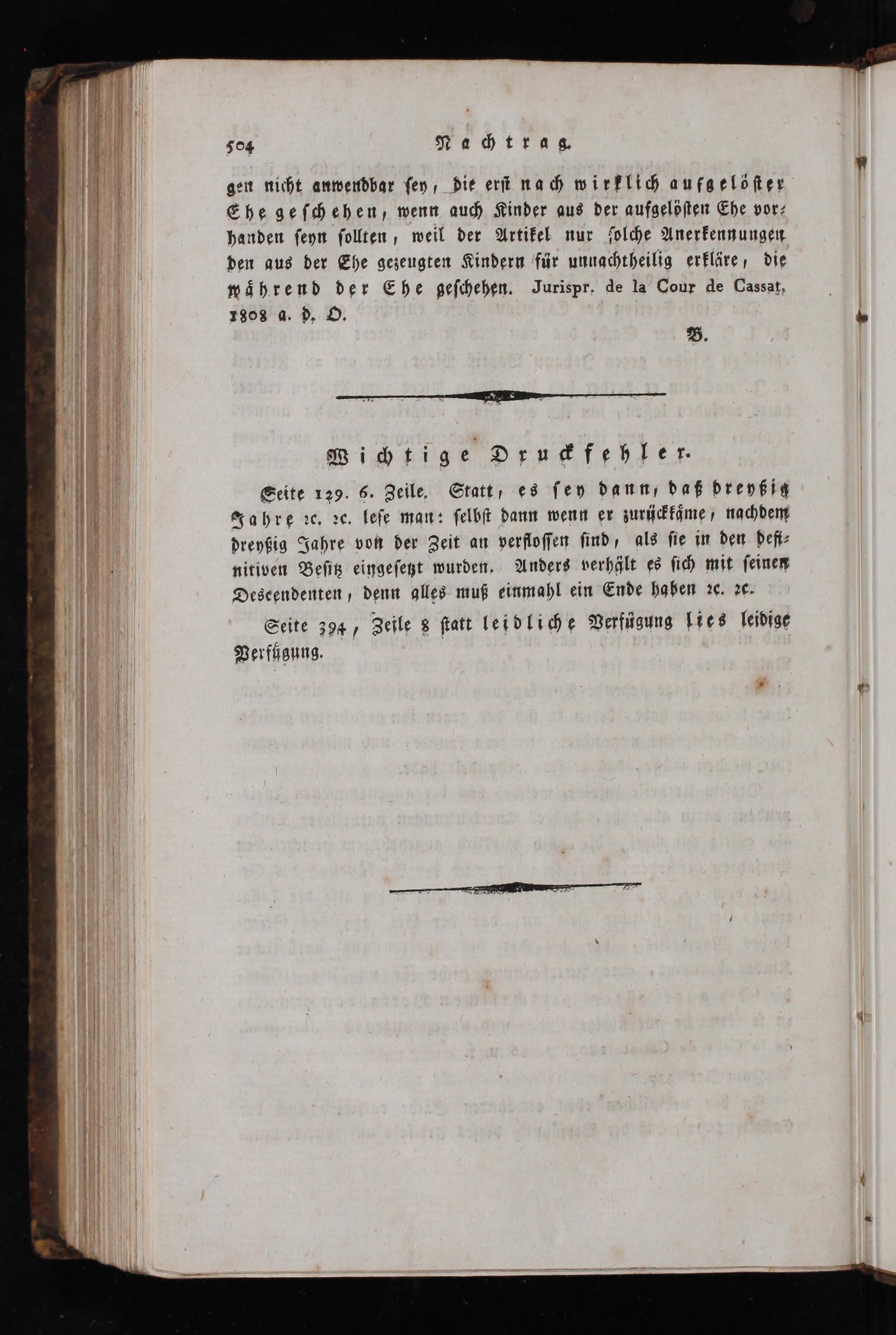 Seite 129. 6. Zeile. Statt, es ſey dann“ daß dreytßis Fahre ꝛc. ꝛc. lefe man: ſelbſt dann wenn er zurückkame, nachdem dreyßig Jahre von der Zeit an verfloſſen ſind, als ſie in den deji⸗ nitiven Beſitz eingeſetzt wurden. Anders verhält es ſich mit ſeinen Descendenten, denn alles muß einmahl ein Ende haben ꝛc. ꝛc.